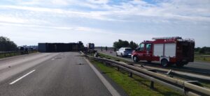 ciężarowy wraz z naczepą, który blokuje całą szerokość jezdni Autostrady A2 w kierunku