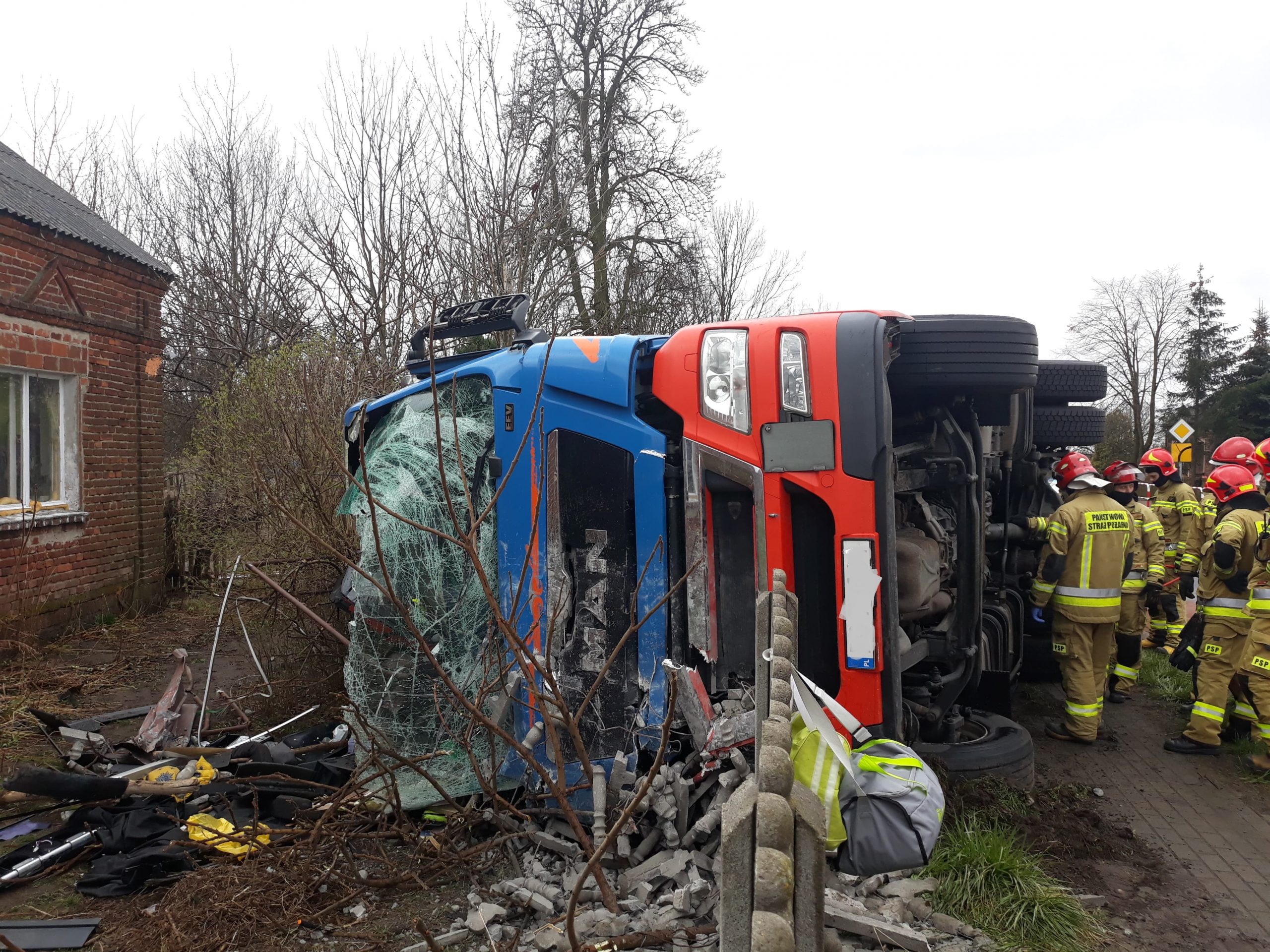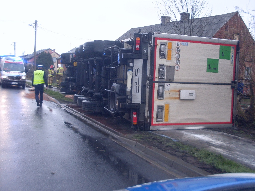 Po przybyciu na miejsce zdarzenia zastano ciągnik siodłowy z naczepą leżący częściowo na terenie posesji. Kierowca opuścił pojazd przed przybyciem strażaków i znajdował się pod opieką będącego na miejscu Zespołu Ratownictwa Medycznego. Ustalono, że w naczepie typu chłodnia przewożone były skóry wołowe. Ponadto uszkodzeniu uległ zbiornik naczepy z olejem napędowym, z tego względu na miejsce zadysponowano Specjalistyczną Grupę Ratownictwa Chemiczno – Ekologicznego z Jednostki Ratowniczo – Gaśniczej Nr 1 w Koninie.
