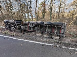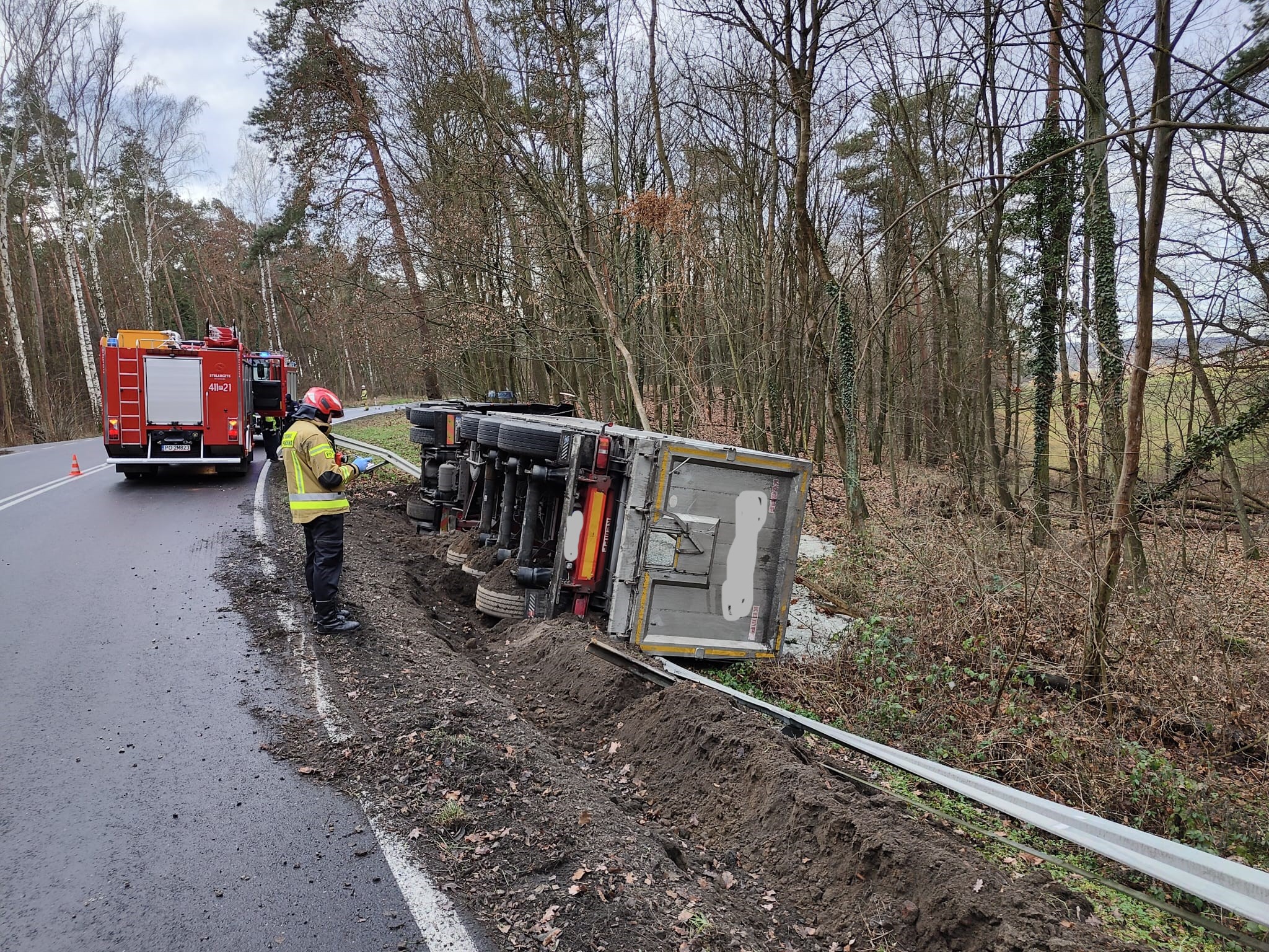 Do zdarzenia zadysponowano jednostki ochrony przeciwpożarowej z JRG Czarnków i OSP KSRG Lubasz. Po dojeździe na miejsce zdarzenia zastano ciągnik siodłowy wraz z naczepą który przewrócił się i znajduje się na poboczu drogi. Kierowca opuścił pojazd przed przyjazdem straży, nie odnosząc żadnych obrażeń.