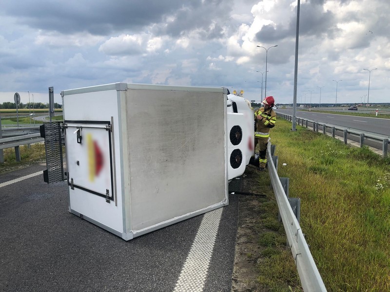Po dotarciu na miejsce zdarzenia stwierdzono, że samochód dostawczy uderzył w bariery energochłonne w wyniku czego przewrócił się na bok i blokuje pas jezdni. Po przeprowadzeniu dokładnego rozpoznania nie stwierdzono osób wymagających pomocy medycznej.
