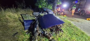 Po dojeździe na miejsce zdarzenia strażacy zastali samochód osobowy marki Volkswagen, który uderzył w drzewo.