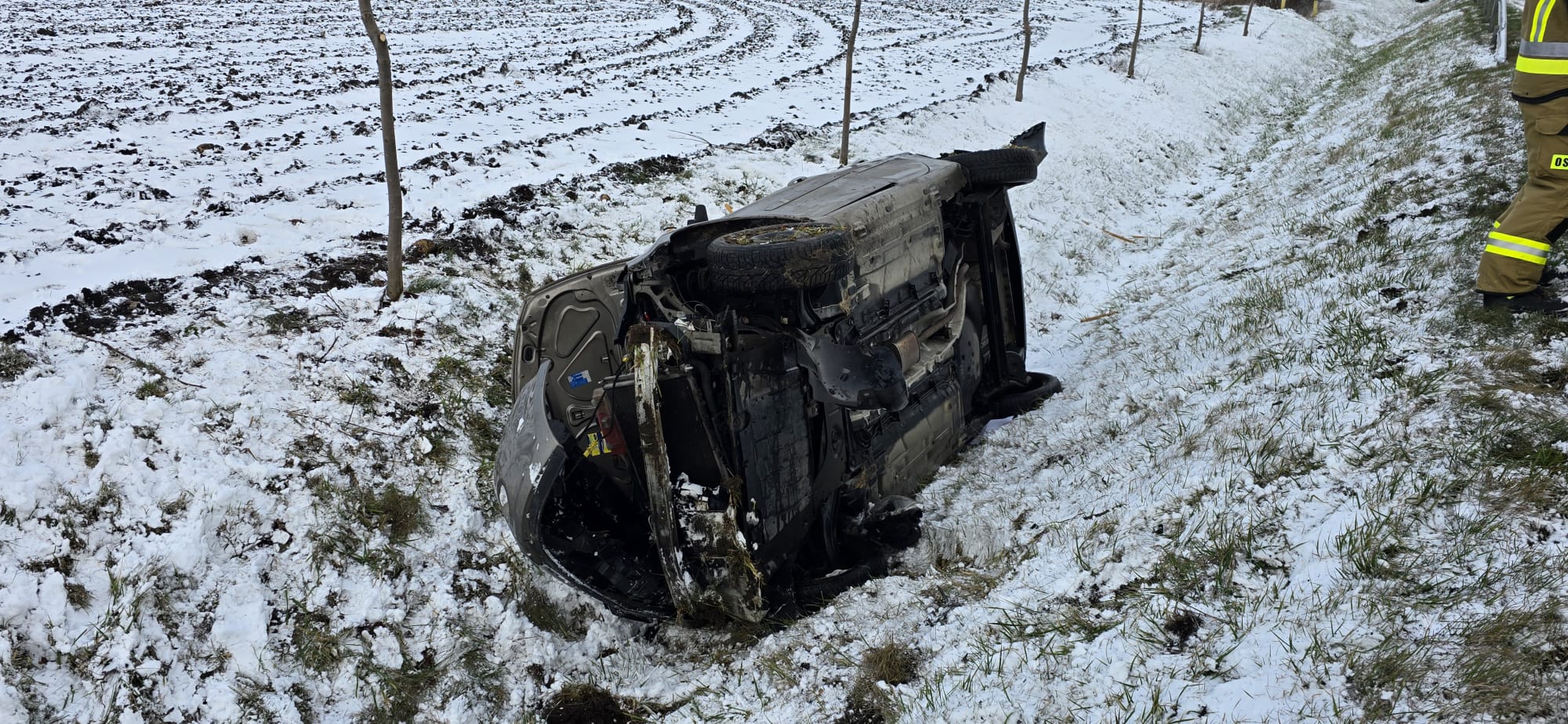 Po dojeździe na miejsce zdarzenia strażacy zastali samochód osobowy, który po dachowaniu znajdował się w rowie. Kierujący był przytomny i znajdował się w pojeździe.