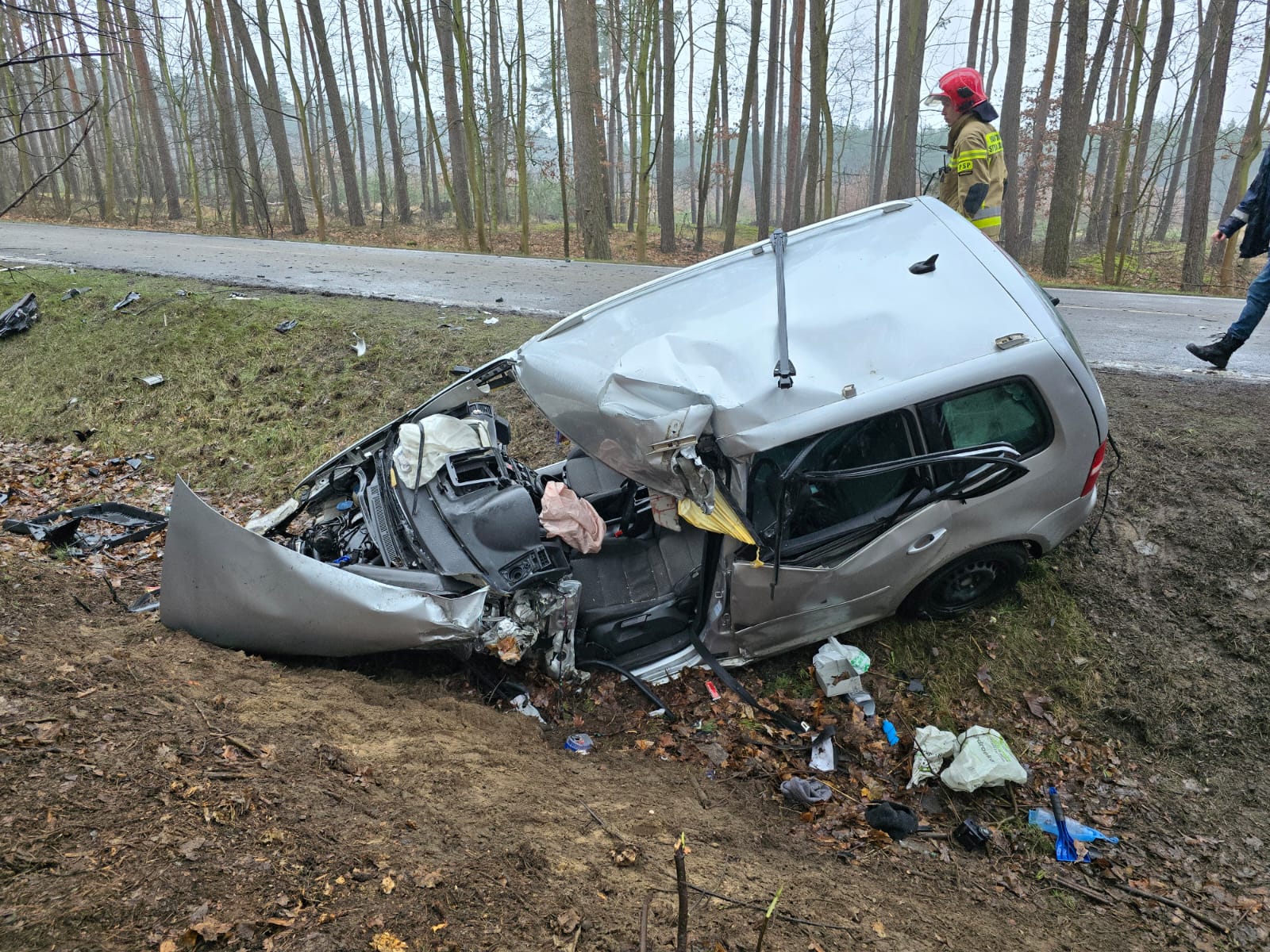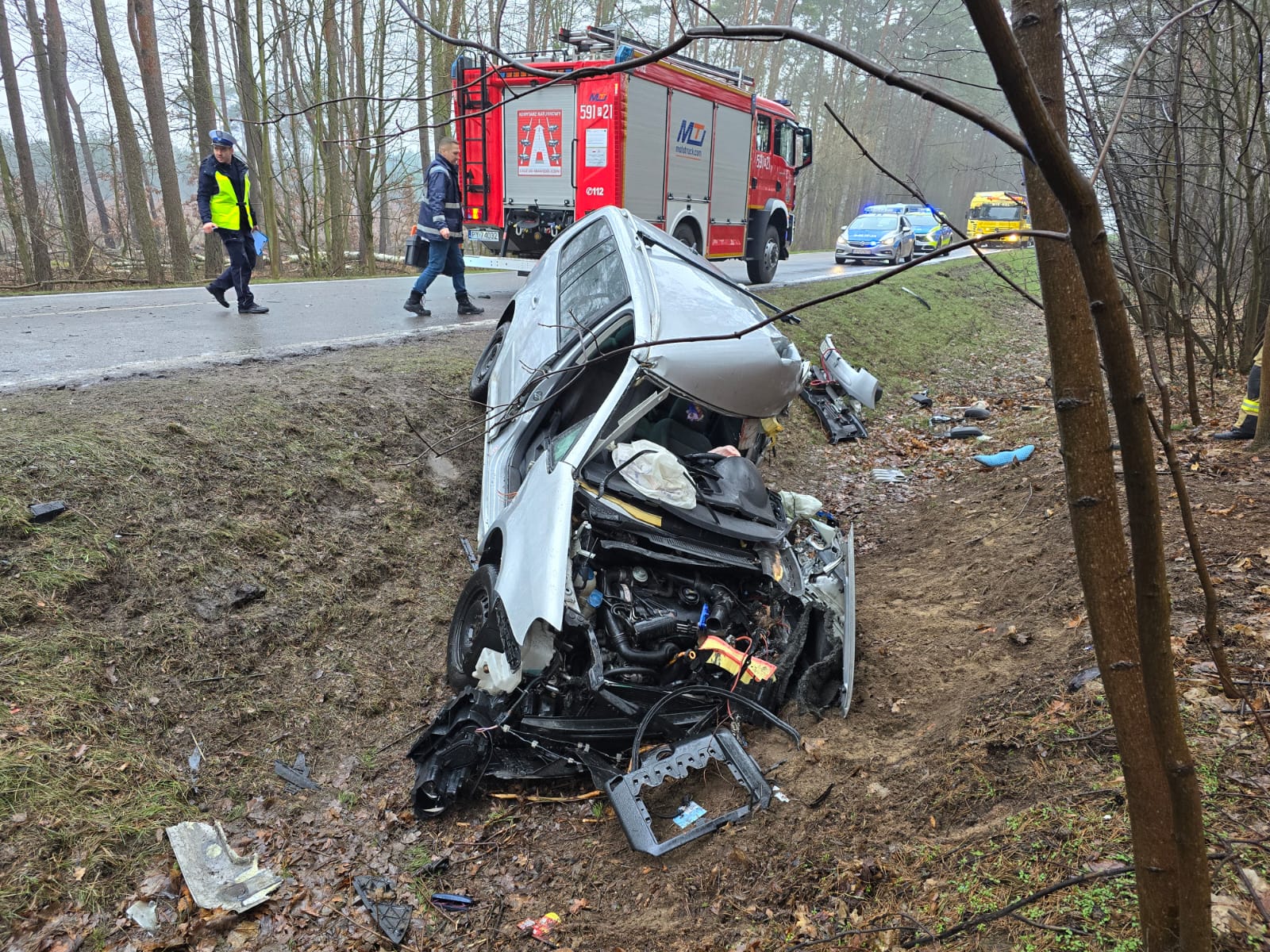 Kierujący i pasażer znajdowali się uwięzieni wewnątrz pojazdu, natomiast kierujący i pasażerowie autokaru opuścili pojazd przed przybyciem SP i znajdowali się w pobliżu. Droga wojewódzka nr 184 była zablokowana.