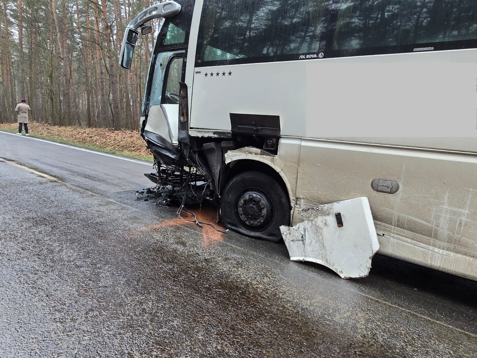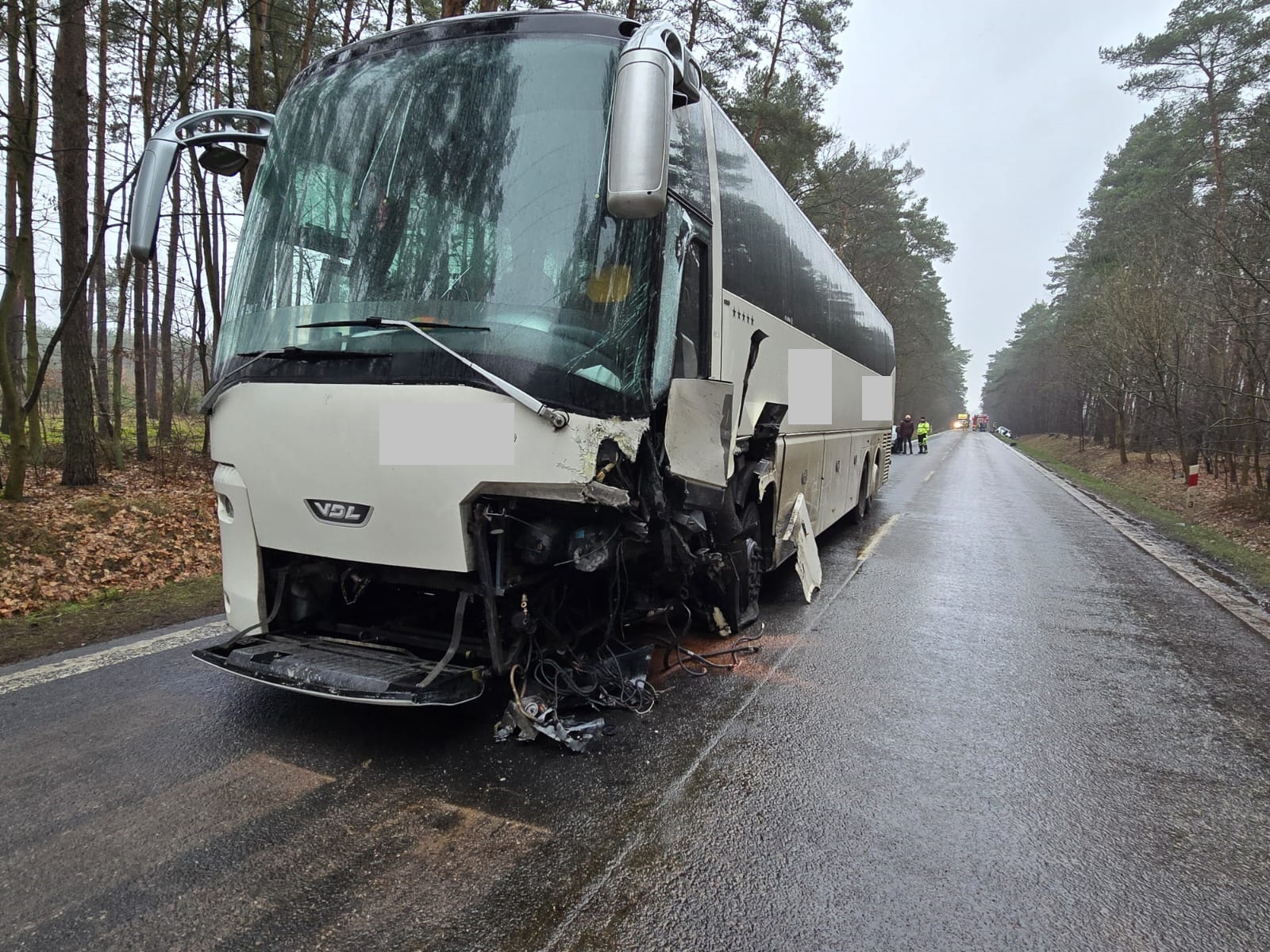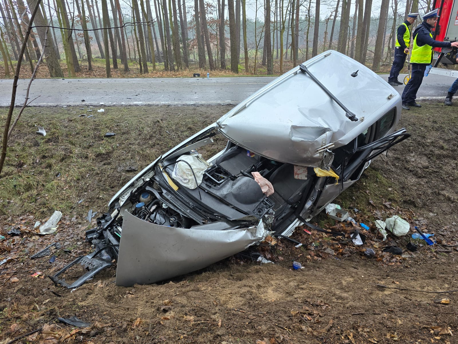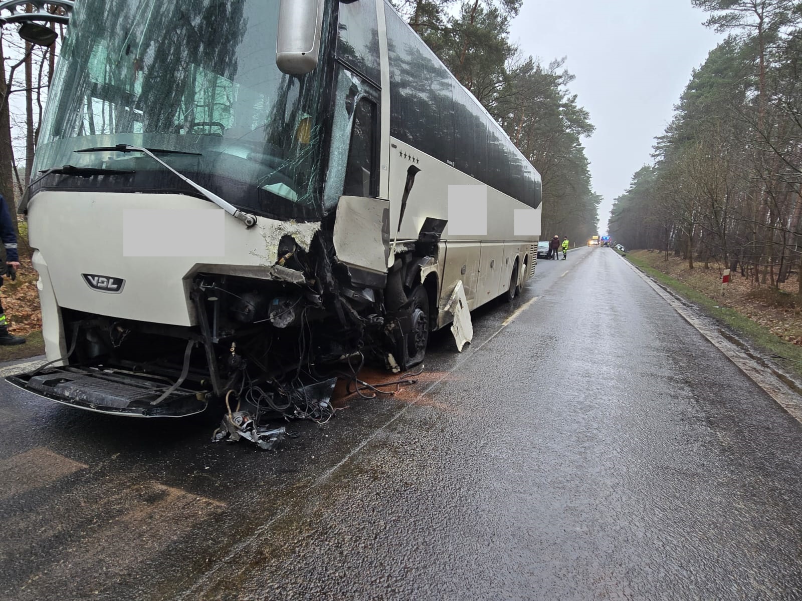 Autokar znajdował się na pasie ruchu, mocno uszkodzony samochód osobowy znajdował się w przydrożnym rowie, natomiast drugi pojazd znajdował się kilkadziesiąt metrów dalej.