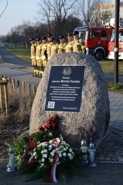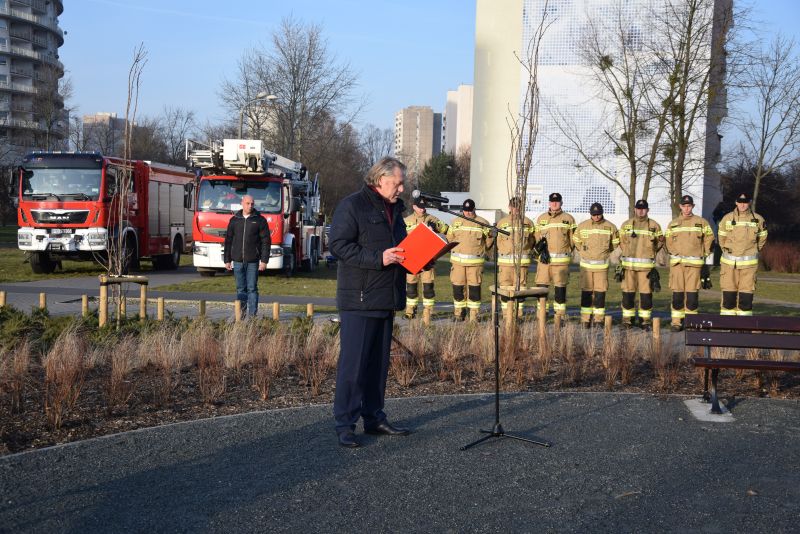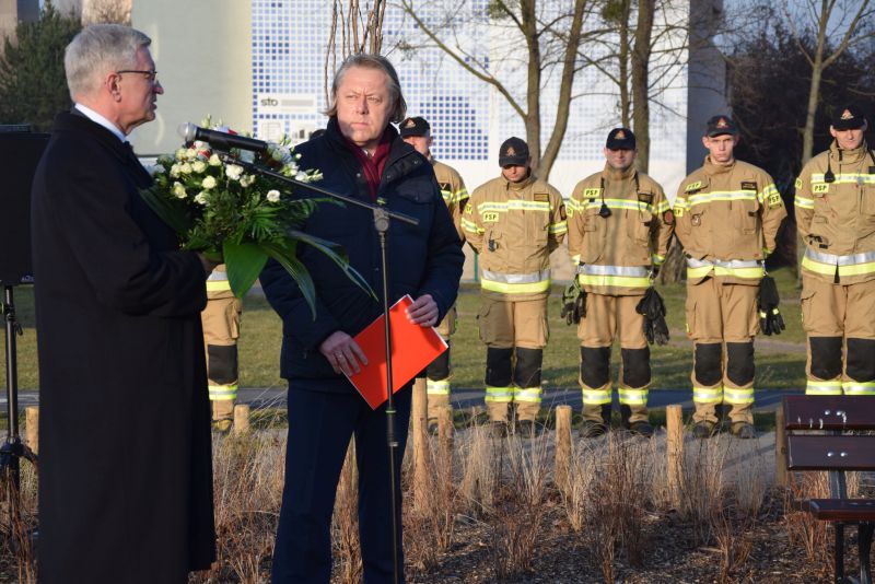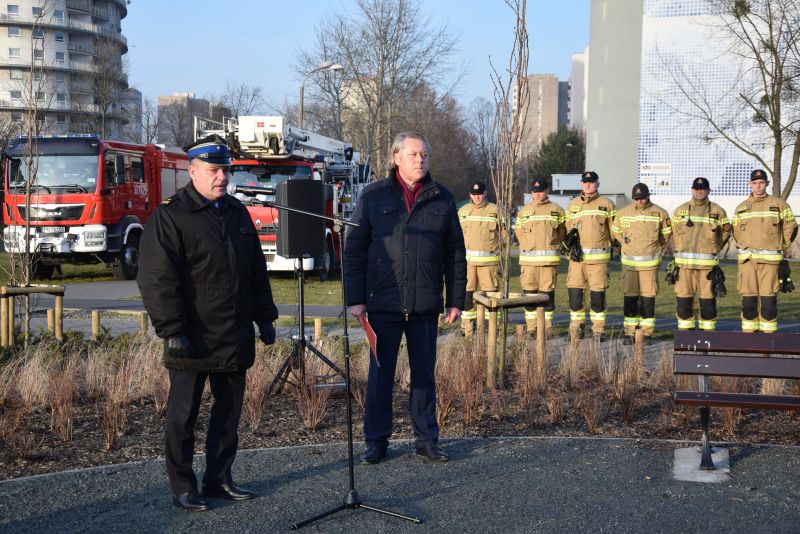 Przybyłych powitał pomysłodawca tego wydarzenia kol. Dariusz Wojcieszak. W krótkich słowach streścił ideę powstania tego miejsca i podziękował władzom miasta Poznania oraz instytucjom i firmom za okazaną pomoc w jej realizacji. Następnie głos zabrał prezydent Poznania, pan Jacek Jaśkowiak. Docenił trud służby strażaków, ich poświęcenie a nawet jak w tym przypadku największą ofiarę. Natomiast zastępca Komendanta Miejskiego bryg. Rafał Kociemba zwrócił uwagę ,że taka forma pamięci zasługuje na najwyższe uznanie. W imieniu rodziny podziękowania złożył pan Leszek Tomiak.