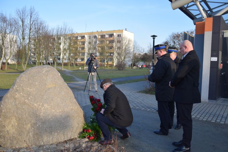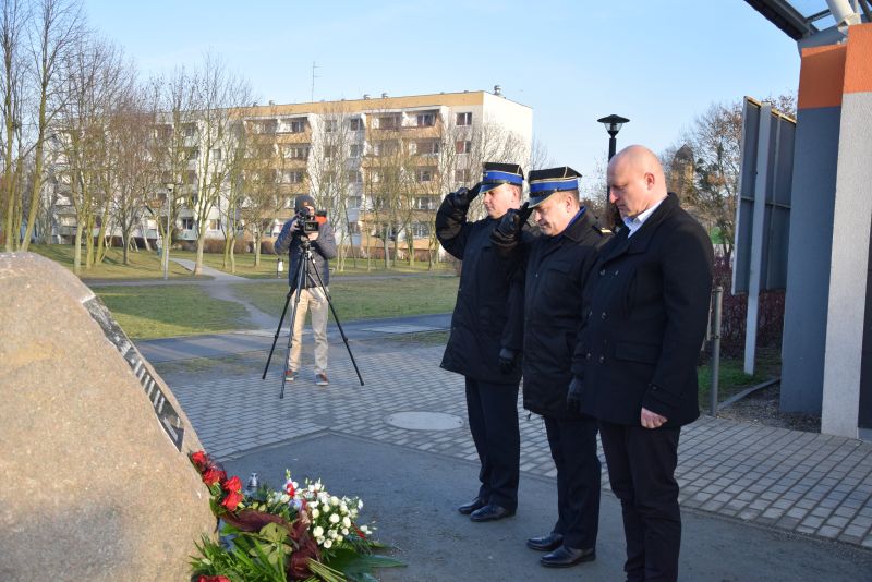 Na zakończenie przed symbolicznym kamieniem w asyście alarmowych sygnałów dźwiękowych z przybyłych wozów strażackich zostały złożone wiązanki kwiatów oraz zapłonęły znicze .