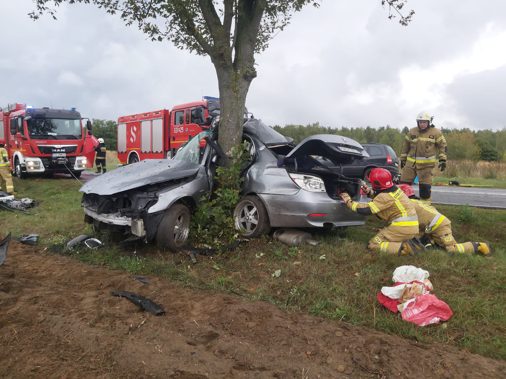 Po przybyciu pierwszych zastępów straży pożarnej na miejsce zdarzenia okazało się, że pojazd osobowy marki BMW uderzył bokiem w przydrożne drzewo.