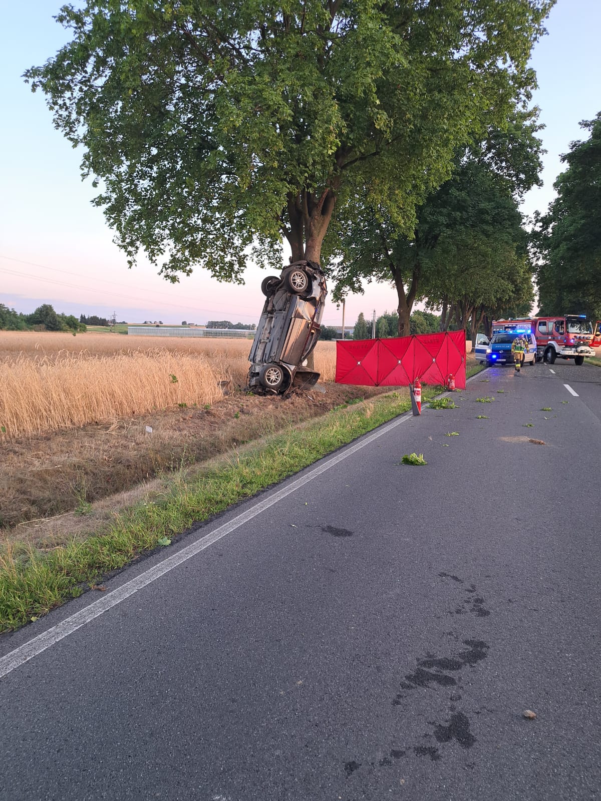 Samochód został zastany stojący pionowo połączony dachem z konarem drzewa skierowany przodem w kierunku ziemi. Samochodem podróżowała jedna osoba, która w wyniku tego zdarzenia poniosła śmierć na miejscu.