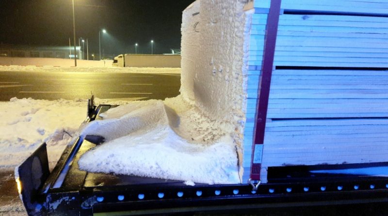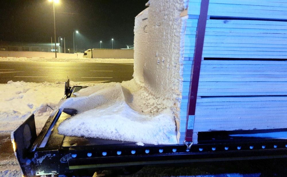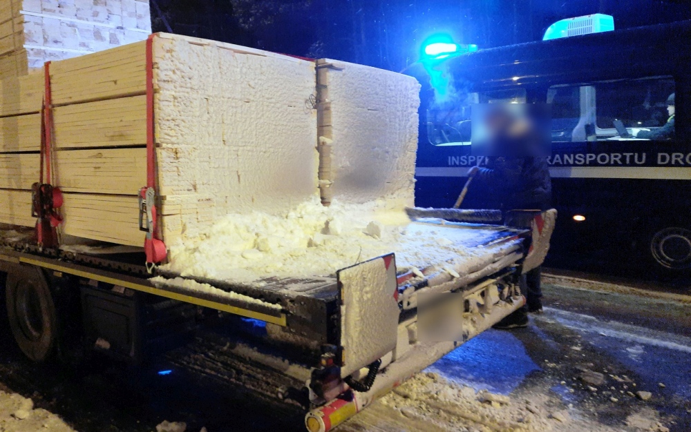 10 lutego inspektorzy z Konina zatrzymali na autostradzie A2 w Żdżarach pojazd członowy przewoźnika z Rosji, którego kierowca wykonywał międzynarodowy transport drogowy tarcicy sosnowej z Rosji do Niemiec. Ładunek 23 ton desek załadowany został na naczepę, która nie była osłonięta plandeką chroniącą przed warunkami atmosferycznymi. Z uwagi na obfite opady śniegu tylna część pojazdu była w dużym stopniu zaśnieżona i pokryta zbitą warstwą lodu, co w przypadku oderwania się mogło spowodować niebezpieczeństwo dla innych użytkowników dróg. Kierowca został pouczony w zakresie konieczności odśnieżania pojazdu i musiał na miejscu kontroli usunąć zalegające warstwy śniegu. Analiza danych cyfrowych z tachografu i karty kierowcy wykazała uchybienia w zakresie prawidłowej obsługi karty kierowcy, za co kontrolowany został ukarany mandatem w wysokości 200 zł.