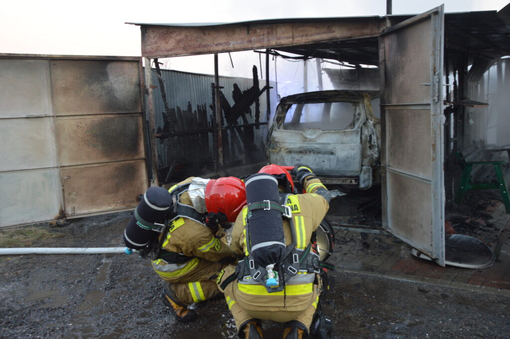 Po przybyciu pierwszych zastępów ratowniczo-gaśniczych potwierdziła się informacja przekazana w zgłoszeniu – pożarem objęty jest garaż, znajdujący się w nim samochód osobowy oraz inne przedmioty przechowywane w blaszanym obiekcie. Płomienie przedostają się na drugi garaż, usytuowany w bardzo bliskim sąsiedztwie. W nim również zaparkowane było auto, jednak właścicielowi udało się je w porę wyprowadzić w bezpieczne miejsce.