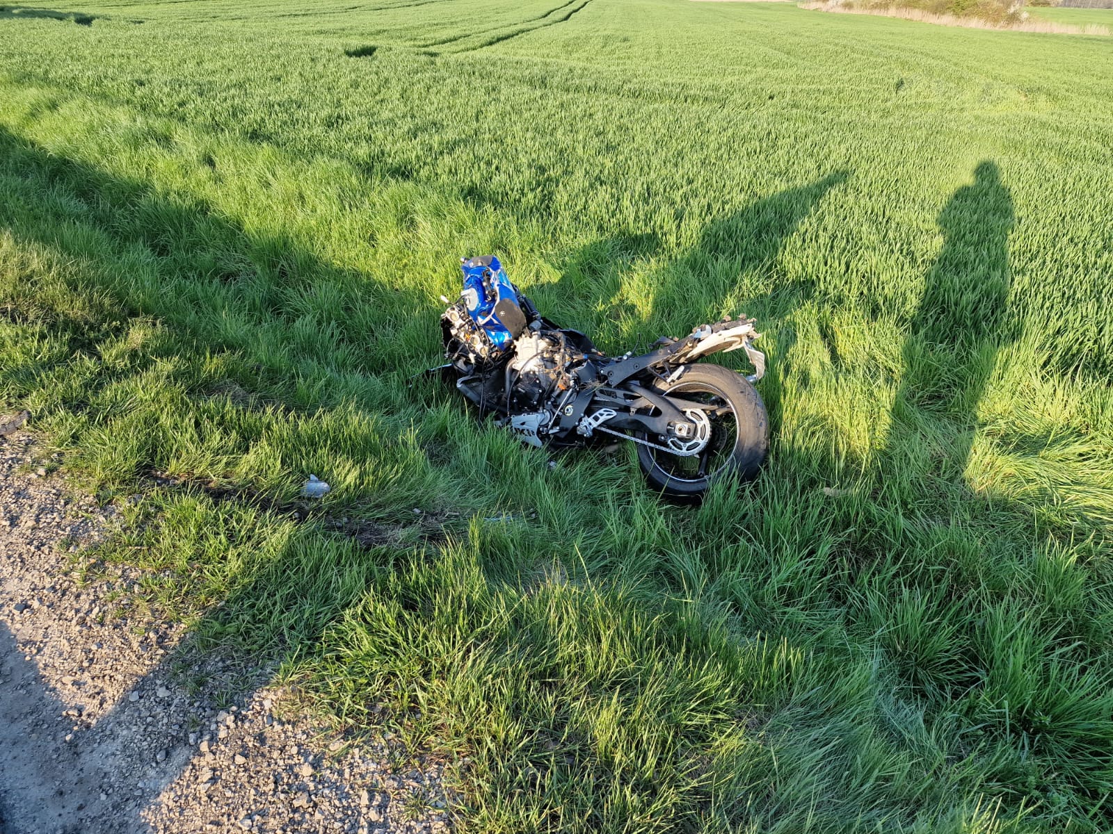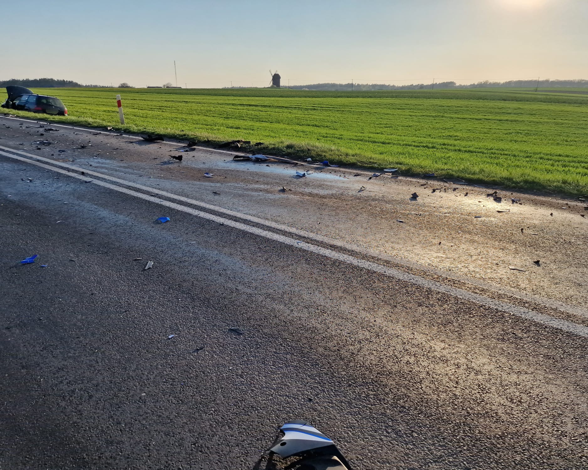 36-letni motocyklista podczas manewru wyprzedzania zderzył się z nadjeżdżającym przeciwległym pasem ruchu samochodem marki Passat, siła zdarzenia spowodowała, że kierowca motocykla wpadł pod samochód marki Ford Mustang.