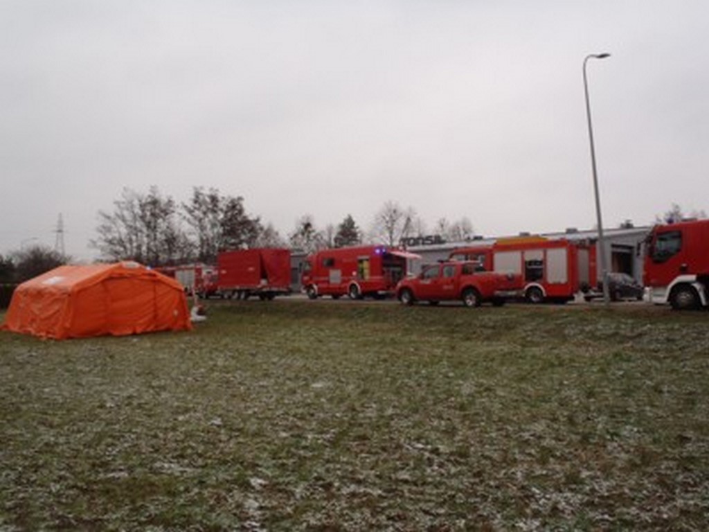 Po przyjeździe na miejsce pierwszych zastępów straży pożarnej pomoc medyczna była udzielana przez służby medyczne dwóm osobom, z których jedna była przytomna, natomiast u drugiej prowadzono resuscytację krążeniowo-oddechową. Strażacy po zabezpieczeniu miejsca zdarzenia nakazali ewakuację wszystkich pracowników, a następnie stosując odpowiednie środki ochrony indywidualnej, dokonali pomiarów wewnątrz pomieszczeń, podczas których mierniki wykazały obecność substancji niebezpiecznych. Kierujący działaniami polecił wówczas zadysponowanie kolejnych sił i środków, m.in. SGRChem z Poznania. W trakcie prowadzonych działań dolegliwości zgłosiły kolejne dwie osoby, którym pomocy udzielili strażacy, a po przybyciu kolejnego ZRM zostali oni zabrani do szpitala.