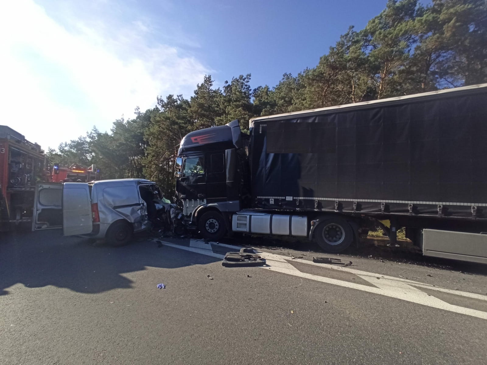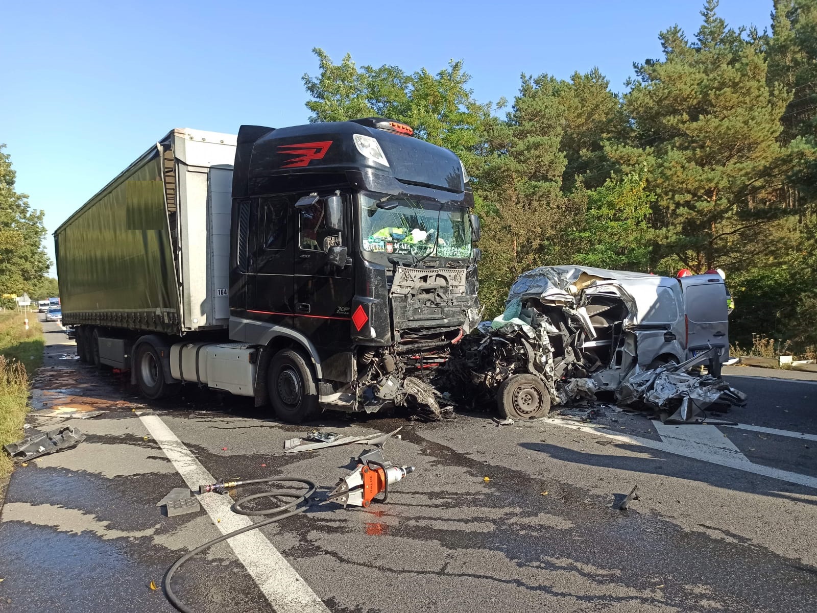 Po przybyciu na miejsce zdarzenia ustalono, że doszło do czołowego zderzenia samochodu ciężarowego z samochodem osobowym. Pojazdy stały na pasie ruchu w kierunku Kalisza. Kierowca samochodu ciężarowego opuścił pojazd o własnych siłach i nie wymagał udzielenia pomocy, natomiast w samochodzie osobowym znajdował się uwięziony nieprzytomny mężczyzna.