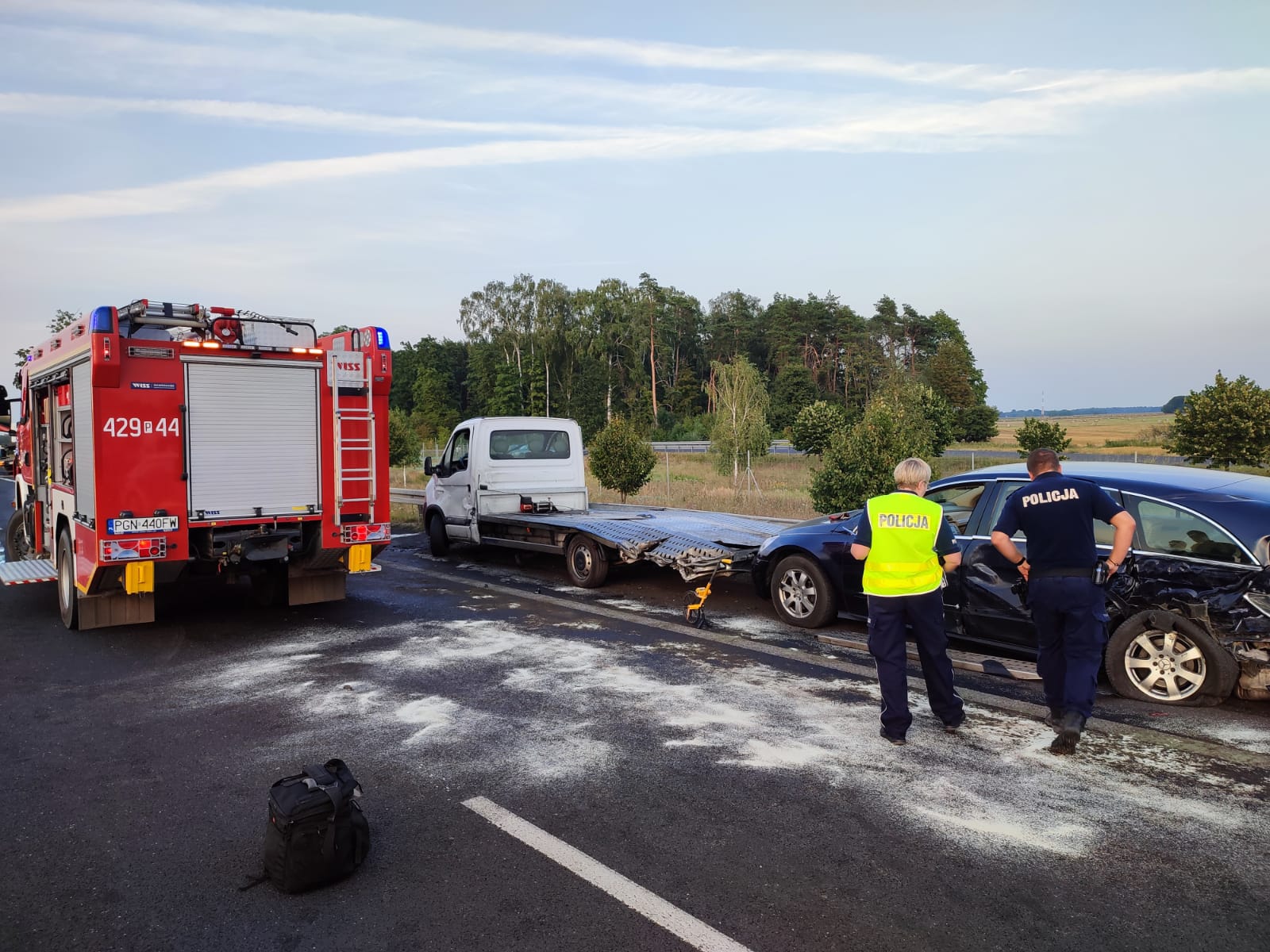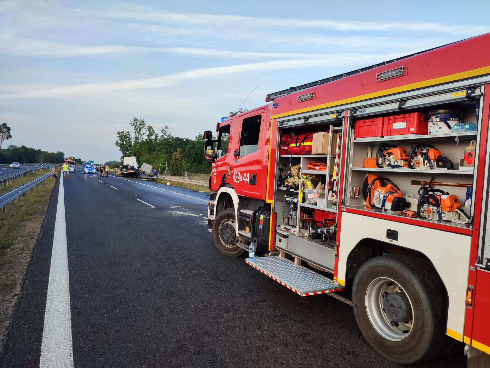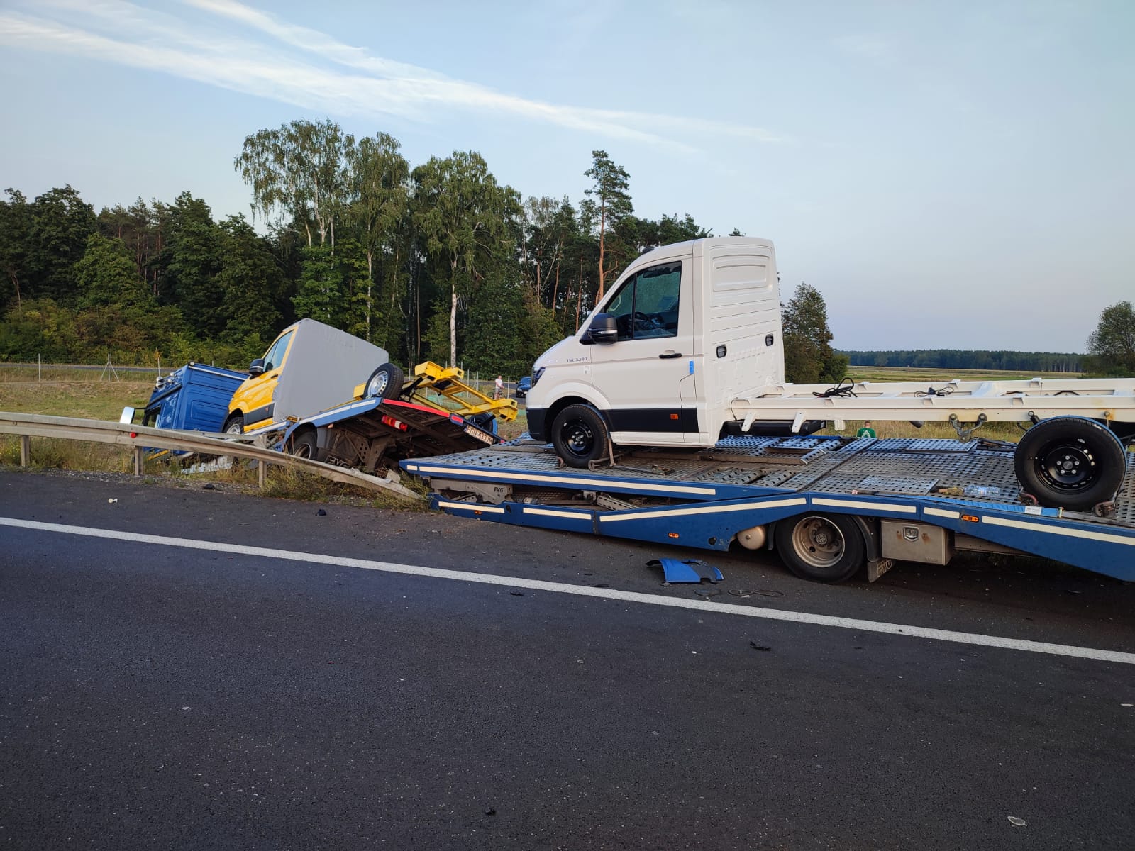 Po przybyciu na miejsce zdarzenia pierwszego zastępu straży pożarnej zastano wypadek dwóch samochodów dostawczych (autolawet) oraz samochodu osobowego. Do wypadku doszło podczas załadunku na autolawetę uszkodzonego samochodu osobowego stojącego na pasie awaryjnym. Podczas tego załadunku druga autolaweta z przyczepą wioząca dwa nowe samochody jadąca drogą S5 z niewyjaśnionych przyczyn potrąciła osobę, która obsługiwała wciągarkę.