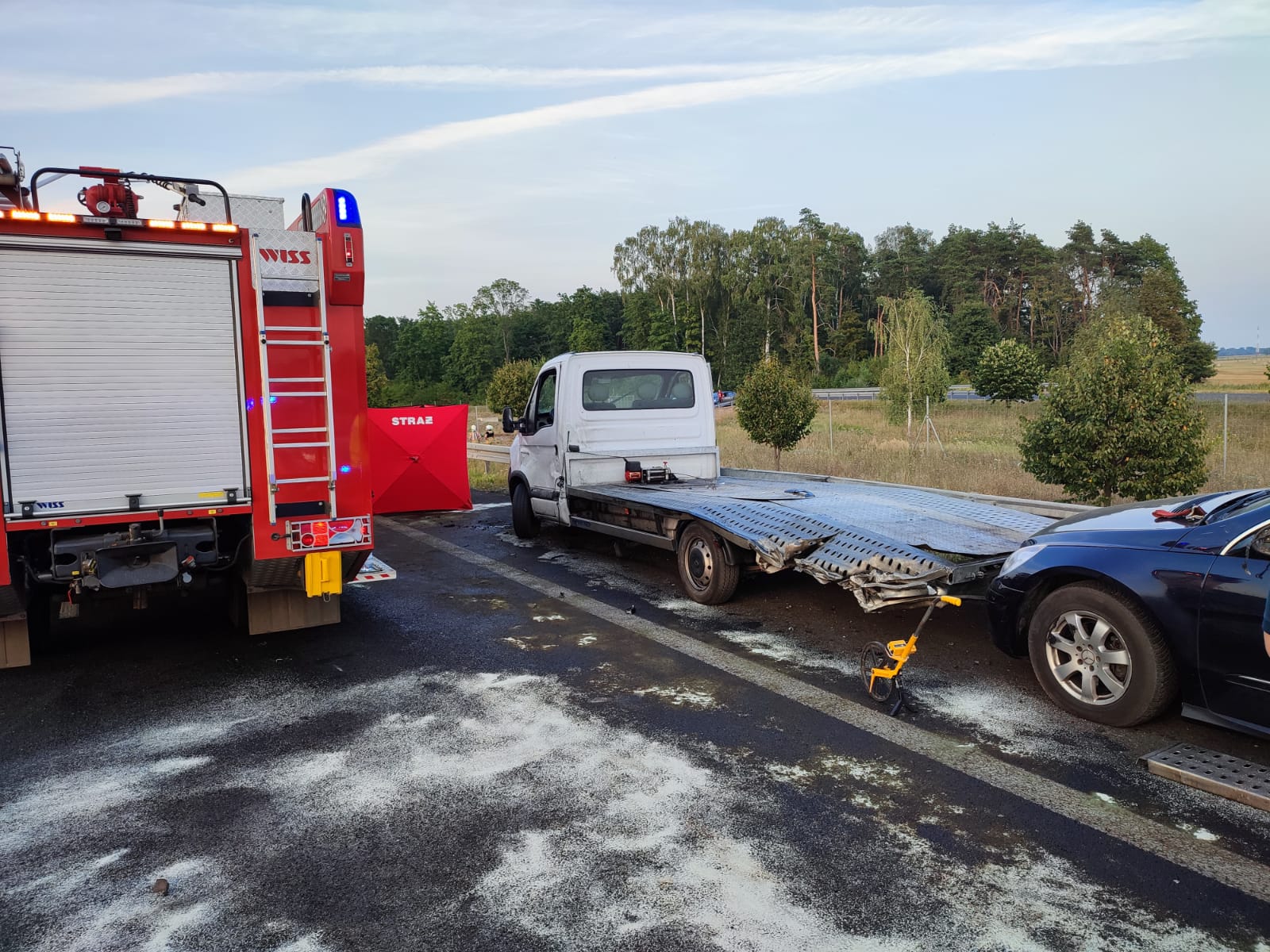 Działania Straży Pożarnej polegały na zabezpieczeniu miejsca zdarzenia oraz prowadzeniu resuscytacji poszkodowanego (z wykorzystaniem AED) do czasu przyjazdu Zespołu Ratownictwa Medycznego. Strażacy udzielili również kwalifikowanej pierwszej pomocy właścicielowi samochodu osobowego, który w momencie załadunku pojazdu przebywał w jego otoczeniu i doznał urazu nogi. Niestety przybyli na miejsce zdarzenia ratownicy medyczni stwierdzili zgon poszkodowanego, który został wcześniej potrącony przez pojazd. Drugi z poszkodowanych z urazem nogi został przetransportowany karetką do szpitala. Dalsze działania polegały na sorpcji rozlanych płynów eksploatacyjnych oraz uprzątnięciu jezdni. Na czas prowadzonych działań droga S5 była zablokowana – Policja zorganizowała objazdy. Okoliczności zdarzenia ustala Policja pod nadzorem Prokuratora.