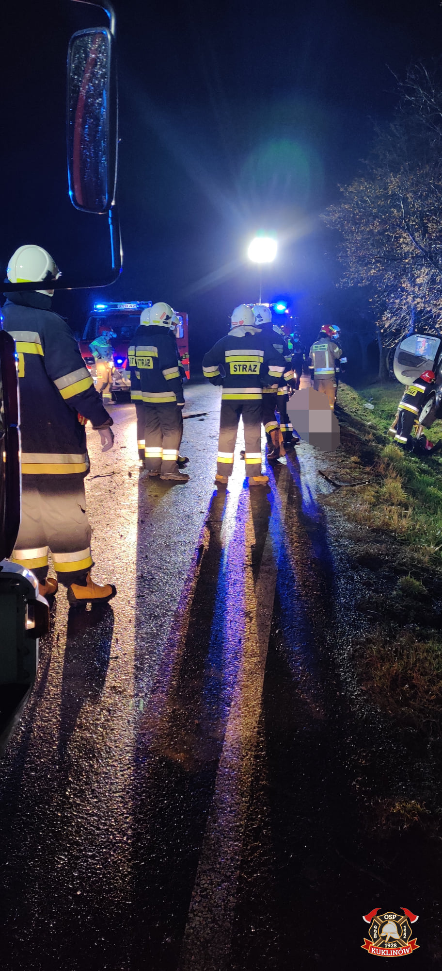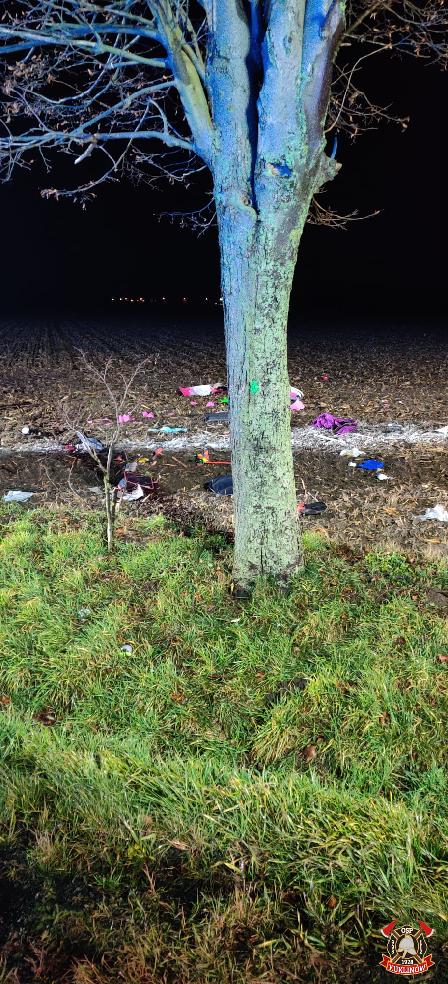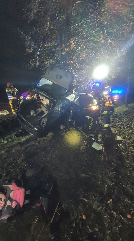 Po przybyciu na miejsce zdarzenia Kierujący Działaniami Ratowniczymi przeprowadził rozpoznanie, w wyniku którego ustalił, że doszło do zdarzenia drogowego. Samochód osobowy Citroen Picasso uderzył w przydrożne drzewo. Wewnątrz pojazdu znajdowała się nieprzytomna kobieta bez funkcji życiowych. Istniało podejrzenie, że kobieta podróżowała z dzieckiem, ponieważ w samochodzie znajdował się fotelik oraz dziecięce ubrania.