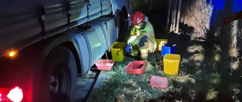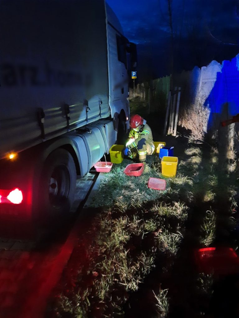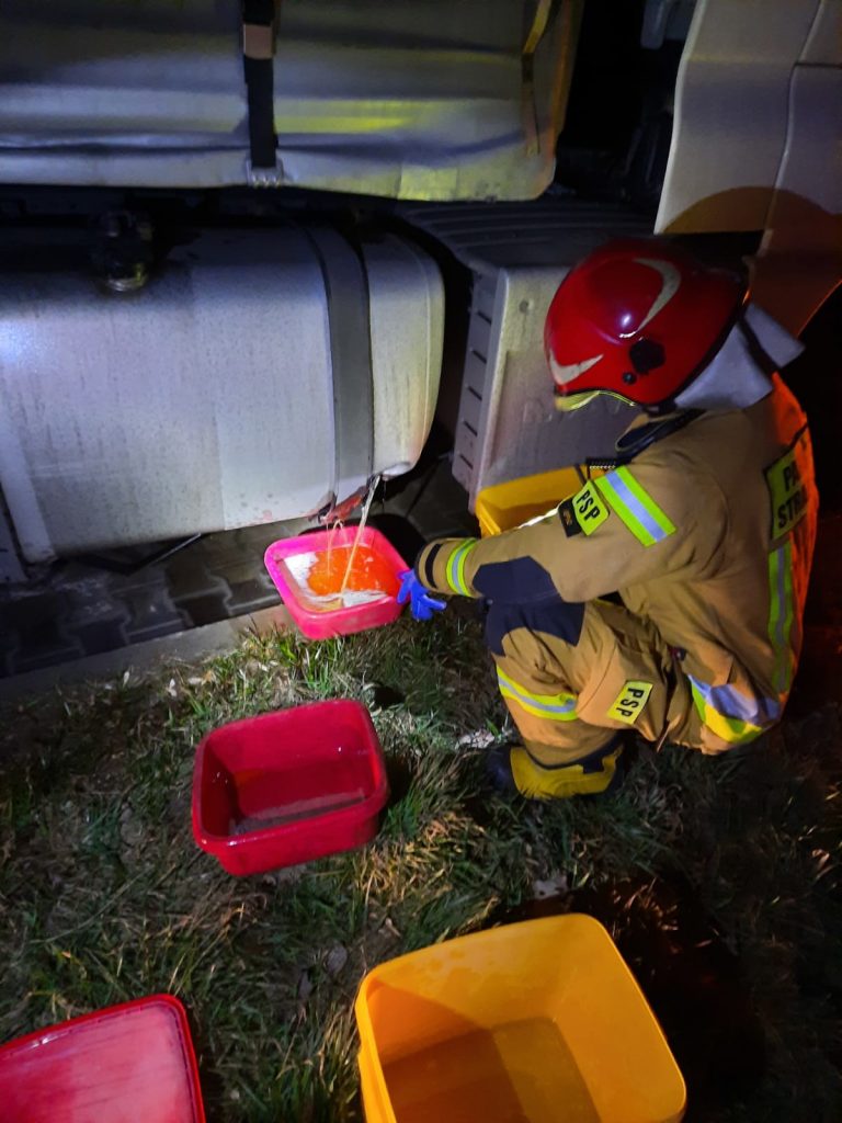 Działania strażaków polegały na zabezpieczeniu i oświetleniu miejsca zdarzenia, następnie wyciekający olej napędowy zebrano i przepompowano do zbiornika zastępczego. Równolegle usunięto pozostałości ropopochodne z jezdni za pomocą sorbentu.
