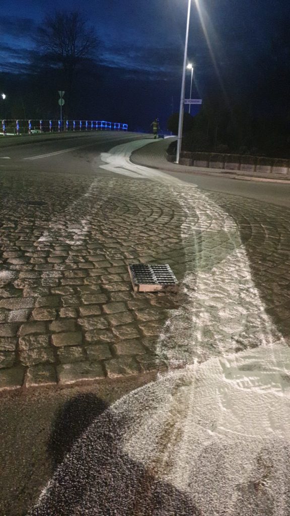 Po przybyciu na miejsce zdarzenia stwierdzono, że pokrywa studzienki kanalizacji deszczowej uszkodziła zbiornik paliwa ciągnika siodłowego. Pojazd po przejechaniu kilkuset zatrzymał się na poboczu drogi.
