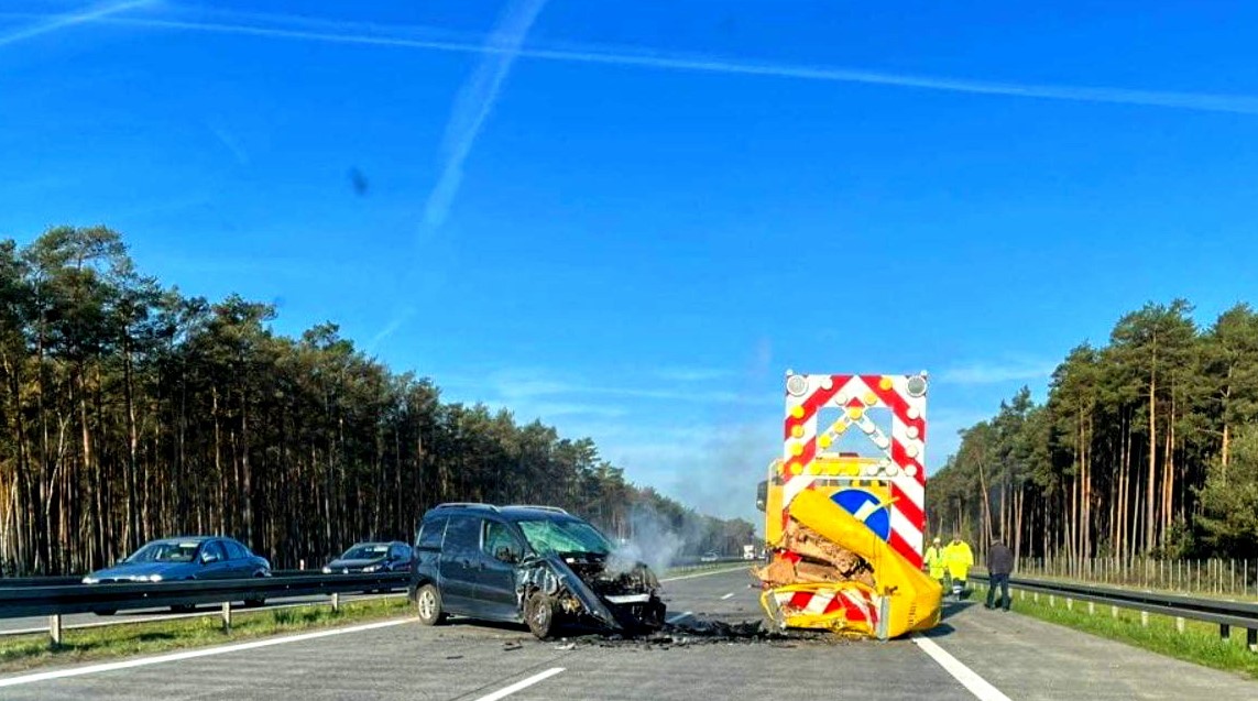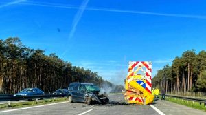 #A2 100 km, kierunek Świecko (za w. Nowy Tomyśl) samochód osobowy uderzył w przyczepkę drogowców. Kierowca poszkodowany, drogowcom nic się nie stało.