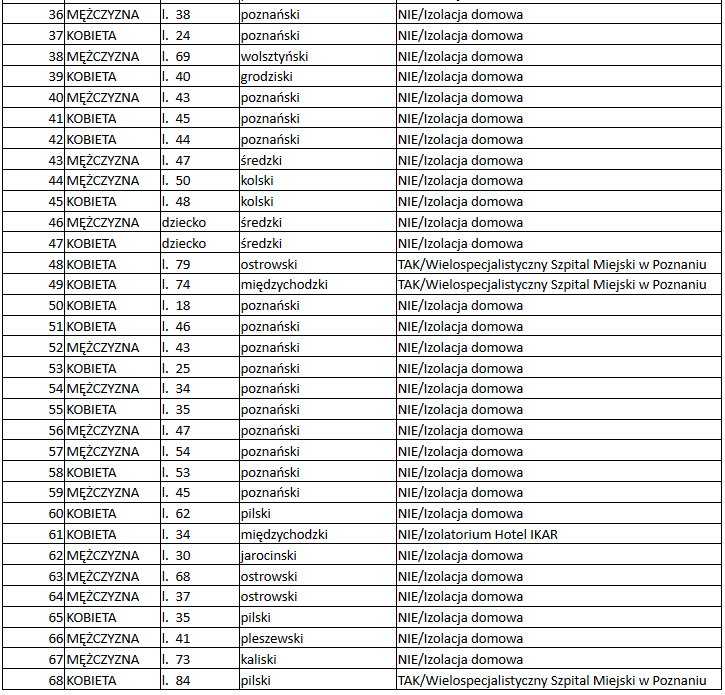 – starszy mężczyzna z powiatu czarnkowsko-trzcianeckiego. W stanie zdrowia dobrym przebywa pod opieką lekarzy w poznańskim szpitalu zakaźnym. Kontakt z osobą zakażoną koronawirusem.