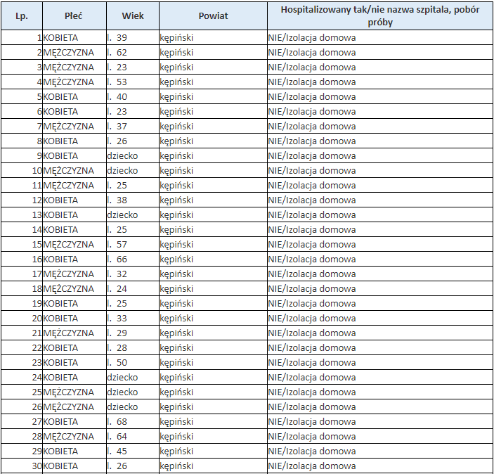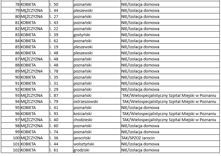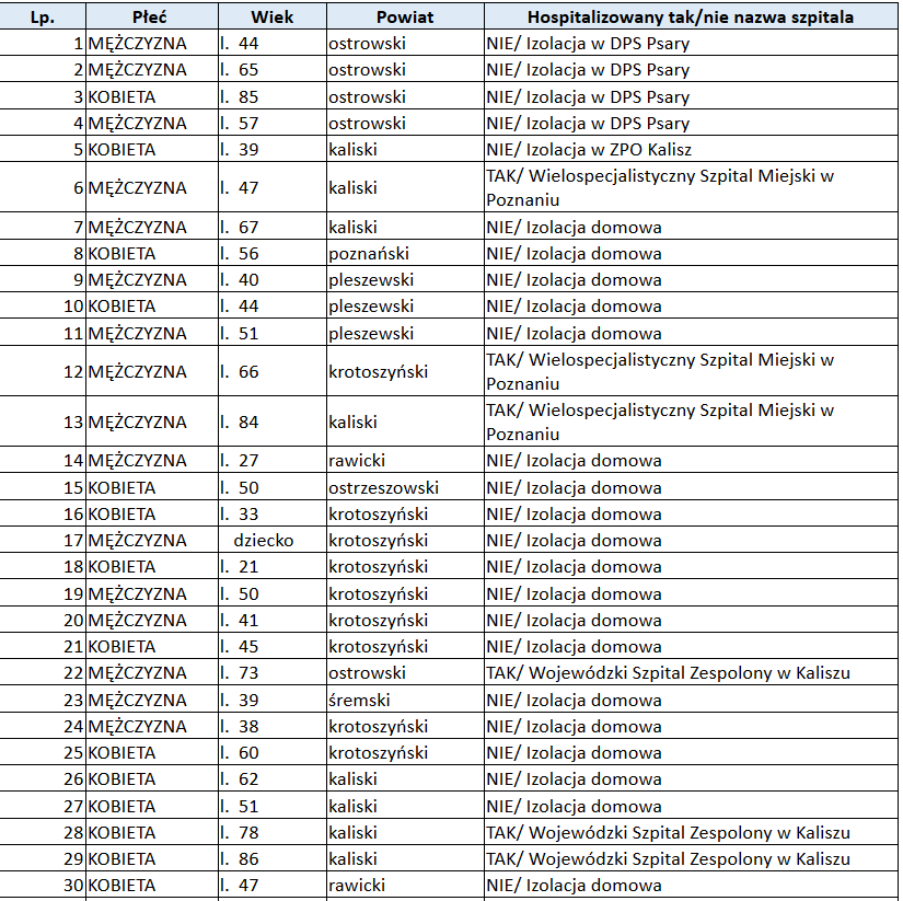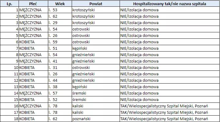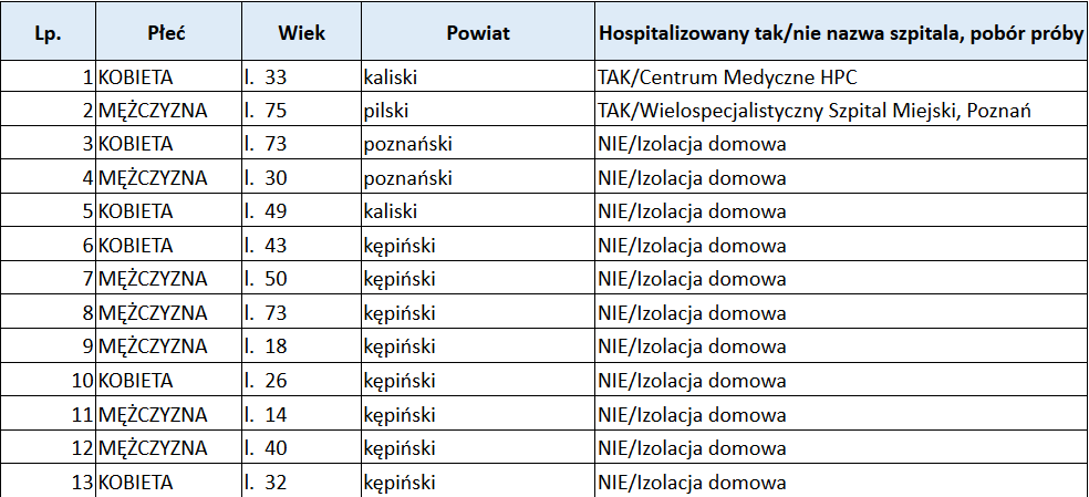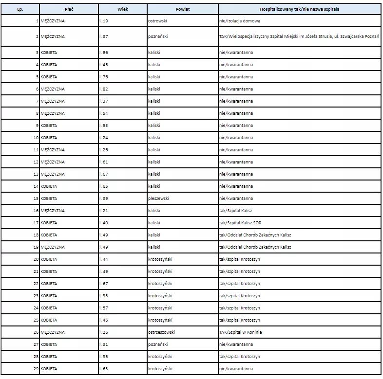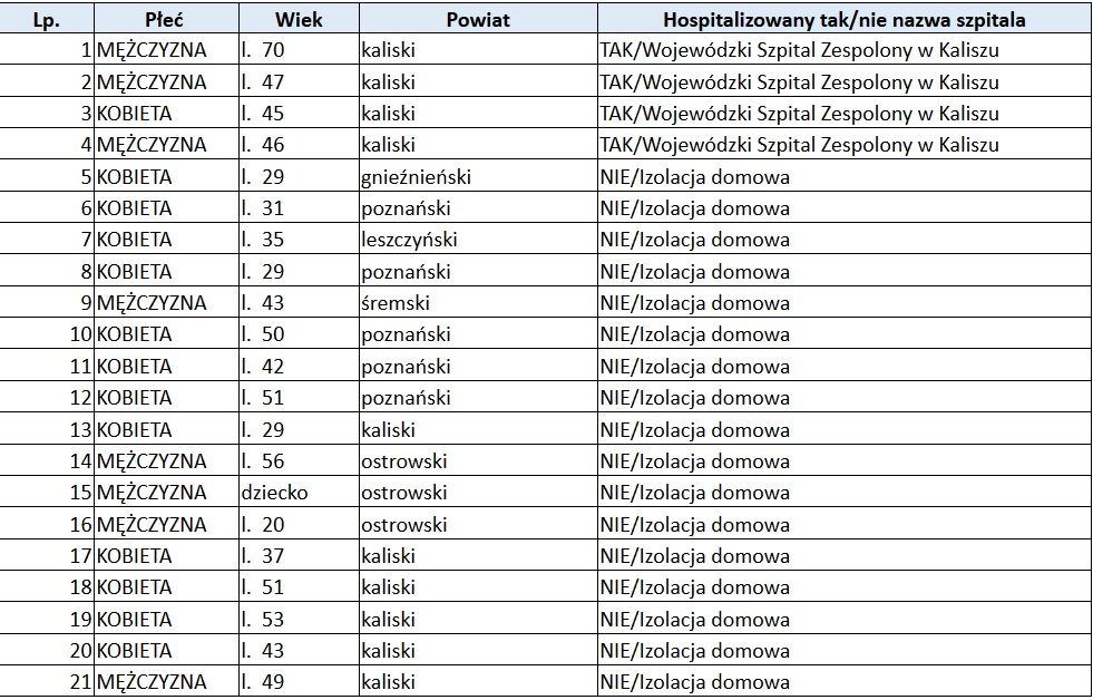 * w tabelce od lewej strony: lp, płeć, wiek, powiat, hospitalizowany tak/nie nazwa szpitala.