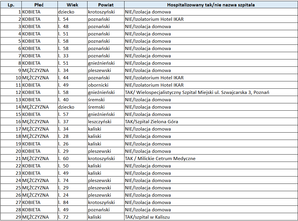 – mężczyzna w średnim wieku z powiatu leszczyńskiego. W dobrym stanie zdrowia przebywa w domu. Podróżował za granicą,- kobieta w średnim wieku z powiatu poznańskiego. W dobrym stanie zdrowia przebywa w domu. Miała kontakt z osobą zakażoną koronawirusem,
