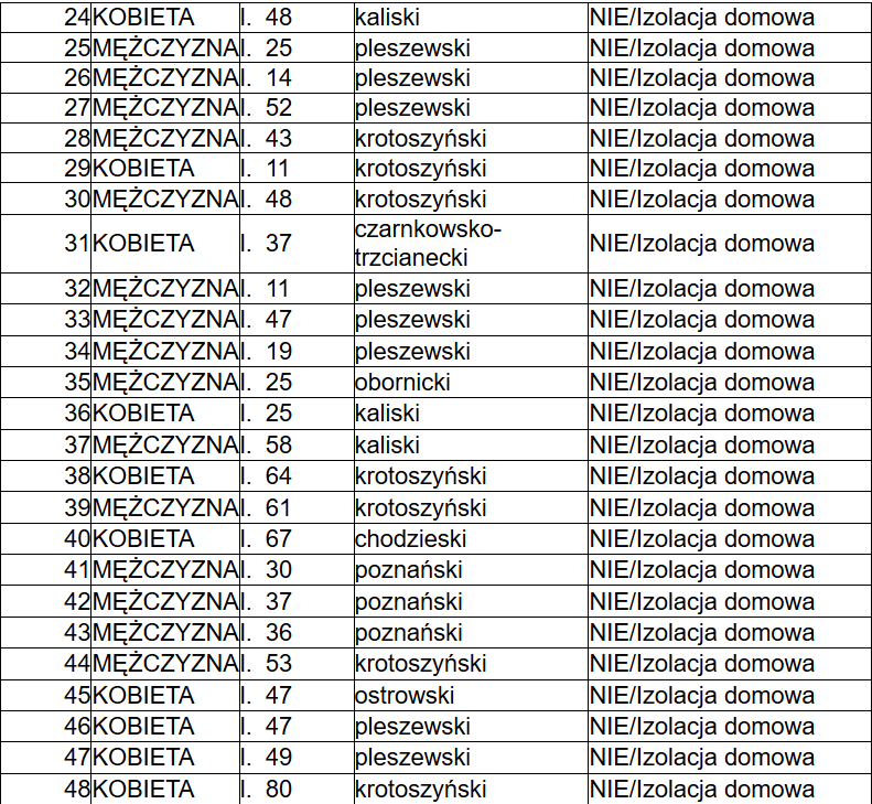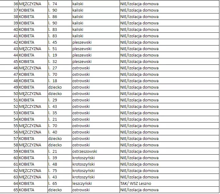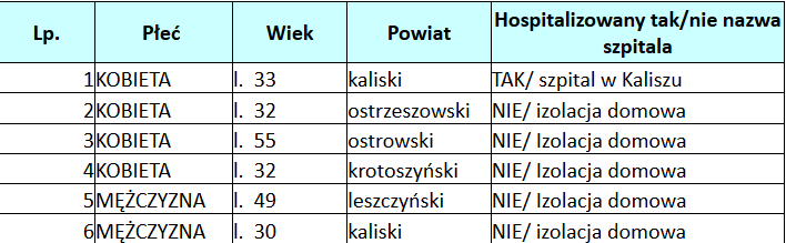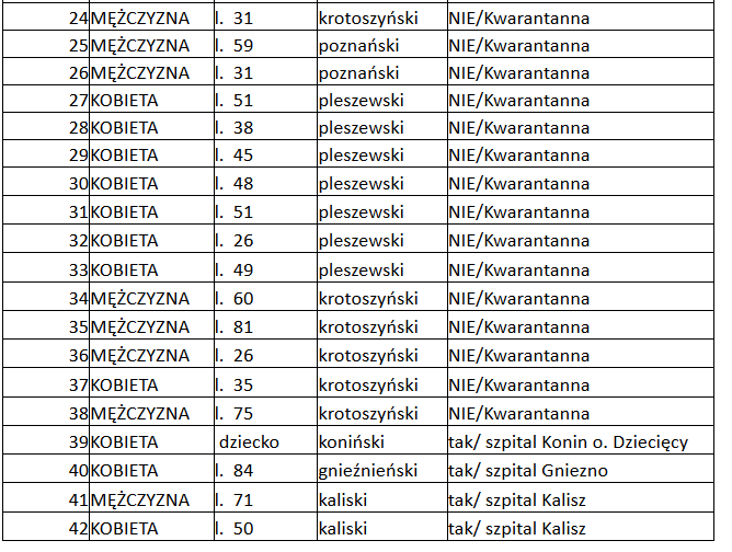 1. Kobieta lat 65, stan dobry, powiat krotoszyński, przebywa w szpitalu powiatowym w Krotoszynie, kontakt z osobą zakażoną koronawirusem 2. kobieta lat 53 , stan dobry, powiat krotoszyński, leży w szpitalu powiatowym w Krotoszynie, kontakt z osobą zakażoną koronawirusem,
