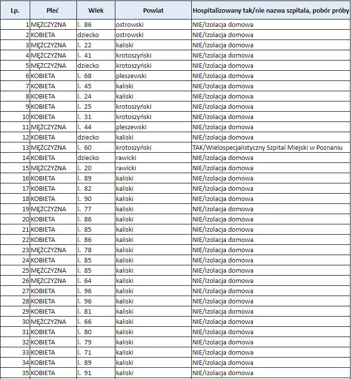 – starszy mężczyzna z powiatu kaliskiego. W stanie średnio ciężkim jest pod opieką lekarzy w szpitalu zakaźnym w Poznaniu. Miał kontakt z osoba zakażoną.