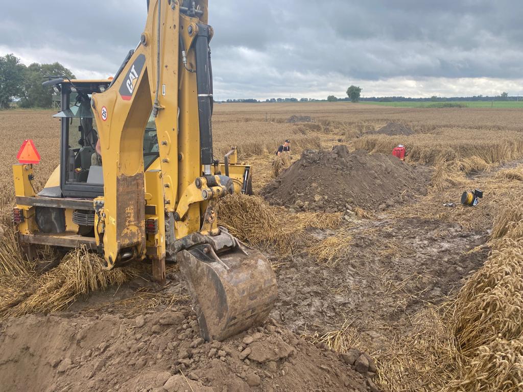 Po dojeździe na miejsce zdarzenia i przeprowadzeniu rozpoznania zlokalizowano wejście do układu melioracyjnego przy pomocy map terenowych, wyznaczono punkt przyjęcia sił i środków oraz wdrożono nawoływanie zwierząt. Następnie po dotarciu SGPR i wymianie informacji opracowano wspólnie plan działań oparty na: nasłuchiwaniu drgań podłoża wykorzystując sprzęt specjalistyczny (geofon), określeniu przebiegu tunelu i wykonaniu wykopów przy pomocy koparki, kontroli odcinkowej robotem kanałowym z Zakładu Komunalnego w Pobiedziskach. W odległości około 80 metrów od początku drenażu zlokalizowano zwierzęta. Dokonano ręcznego bezpiecznego wykopu i odnaleziono trzy psy w dobrej kondycji.