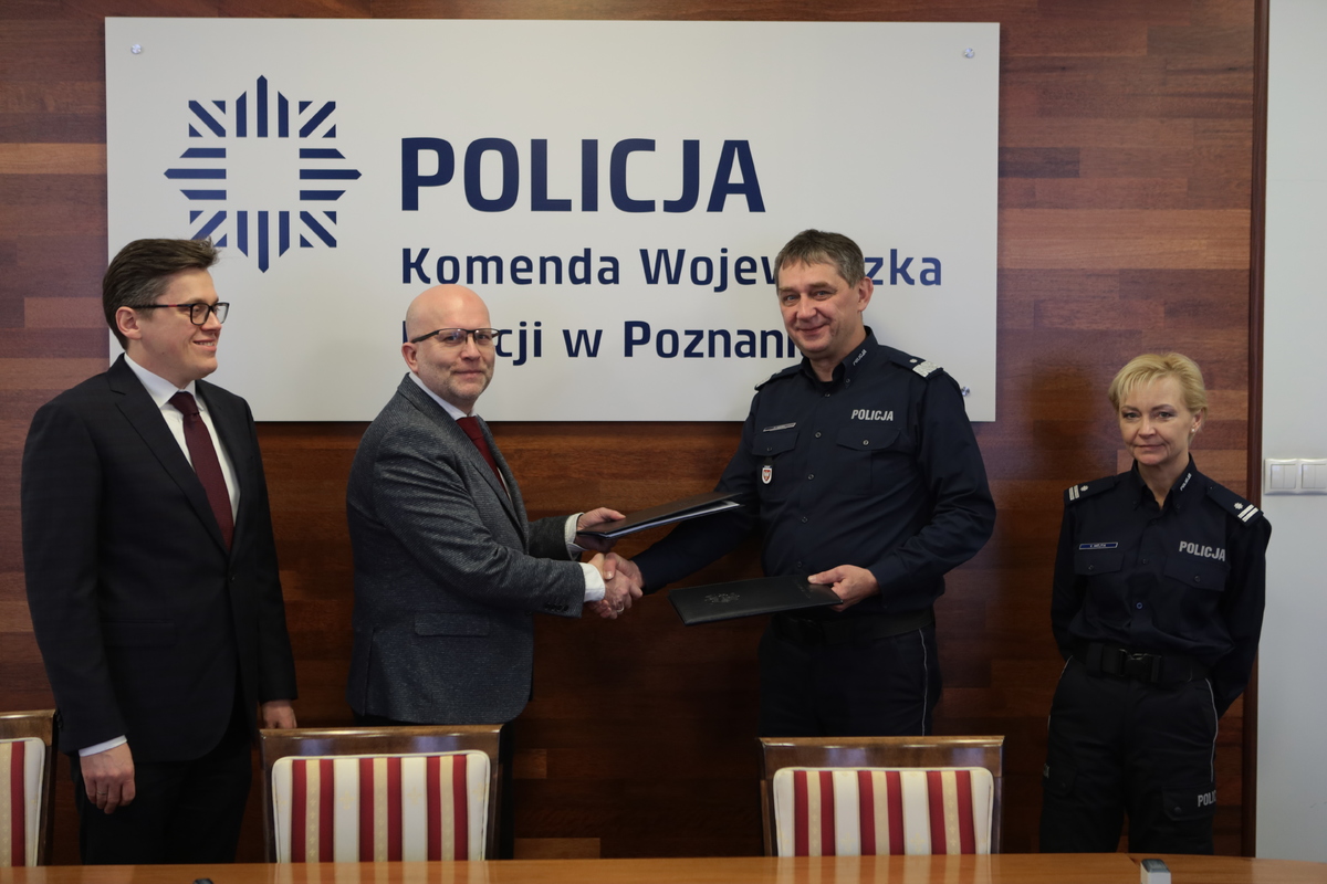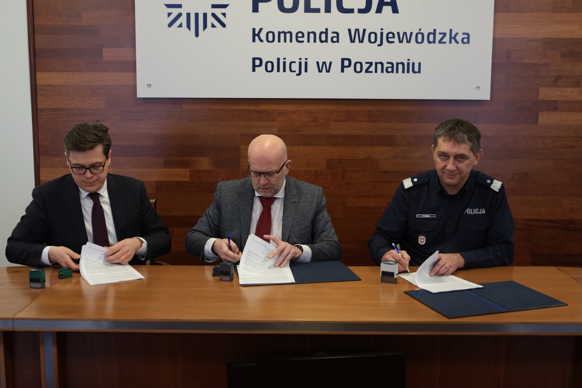 Nadinsp. Piotr Mąka Komendant Wojewódzki Policji w Poznaniu w obecności podins. Violetty Mójty Zastępcy Komendanta Wojewódzkiego Policji w Poznaniu ds. Logistyki, podpisał umowę z panem Mariuszem Niewiadomskim i panem Jackiem Hnatiukiem prokurentami firmy DEKPOL BUDOWNICTWO na budowę siedziby Laboratorium Kryminalistycznego KWP w Poznaniu.