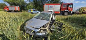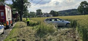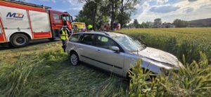 Po dojeździe na miejsce zdarzenia strażacy zastali samochód osobowy marki Volvo, który uderzył lewym bokiem w drzewo i wjechał na pobliskie pole. Kierujący i pasażer (dziecko) opuścili pojazd przed przybyciem SP i znajdowali się w pobliżu.