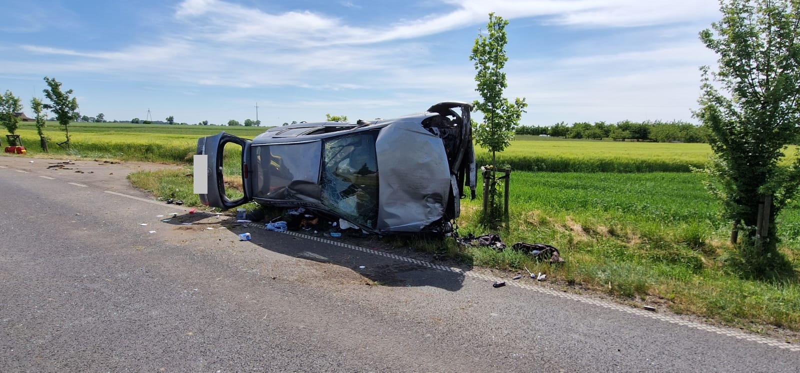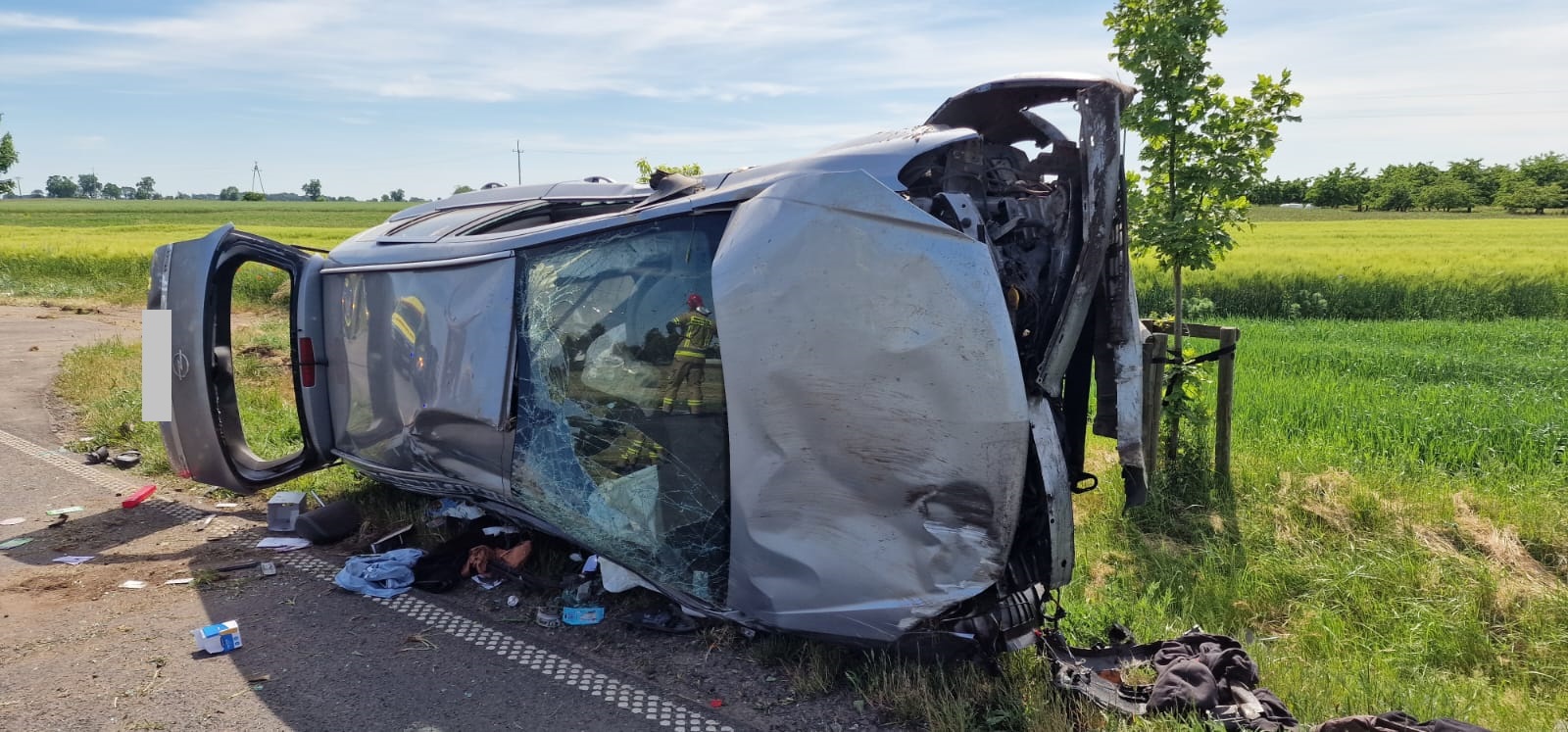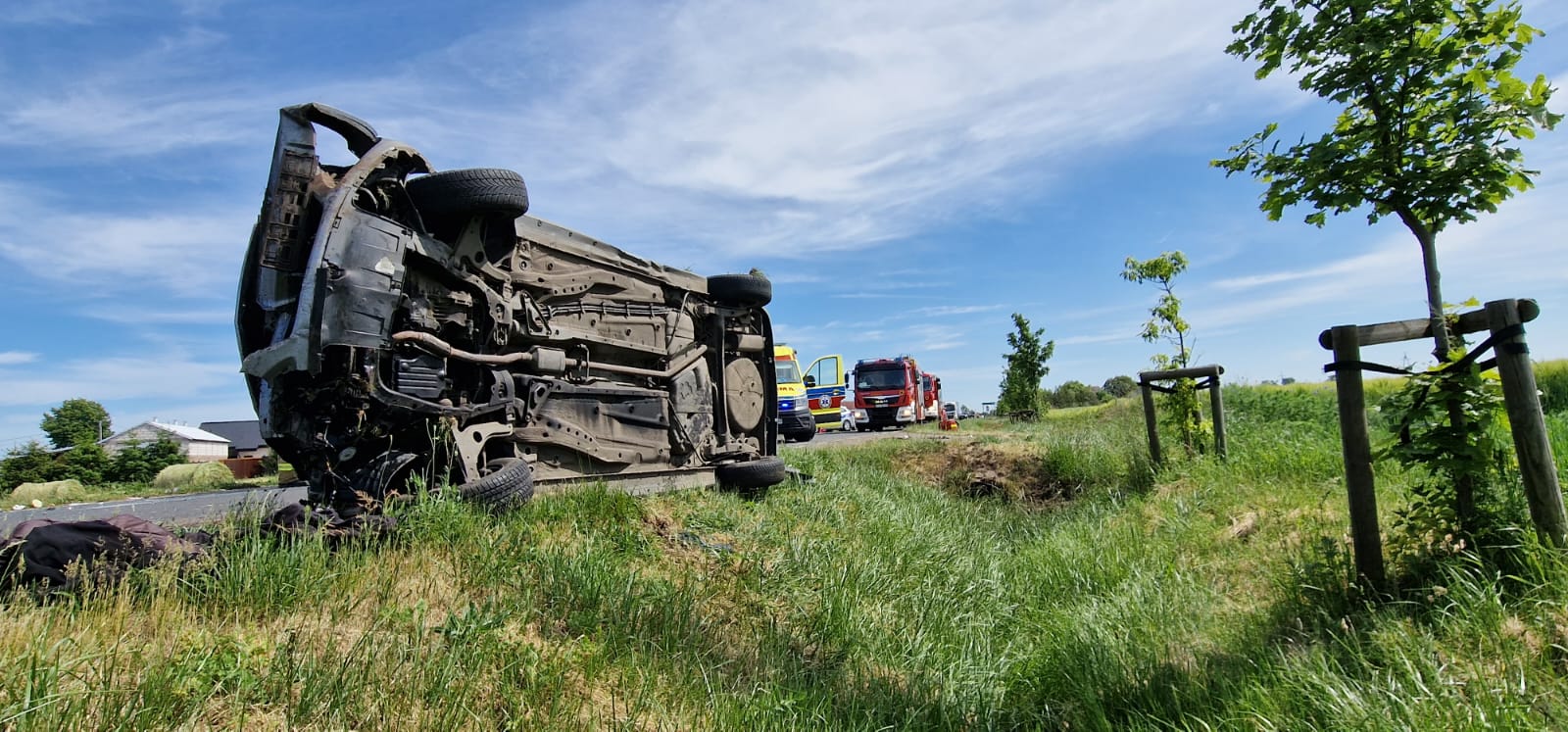 Jeden pojazd znajdował się na środku drogi, natomiast drugi po dachowaniu w znajdował się na poboczu
