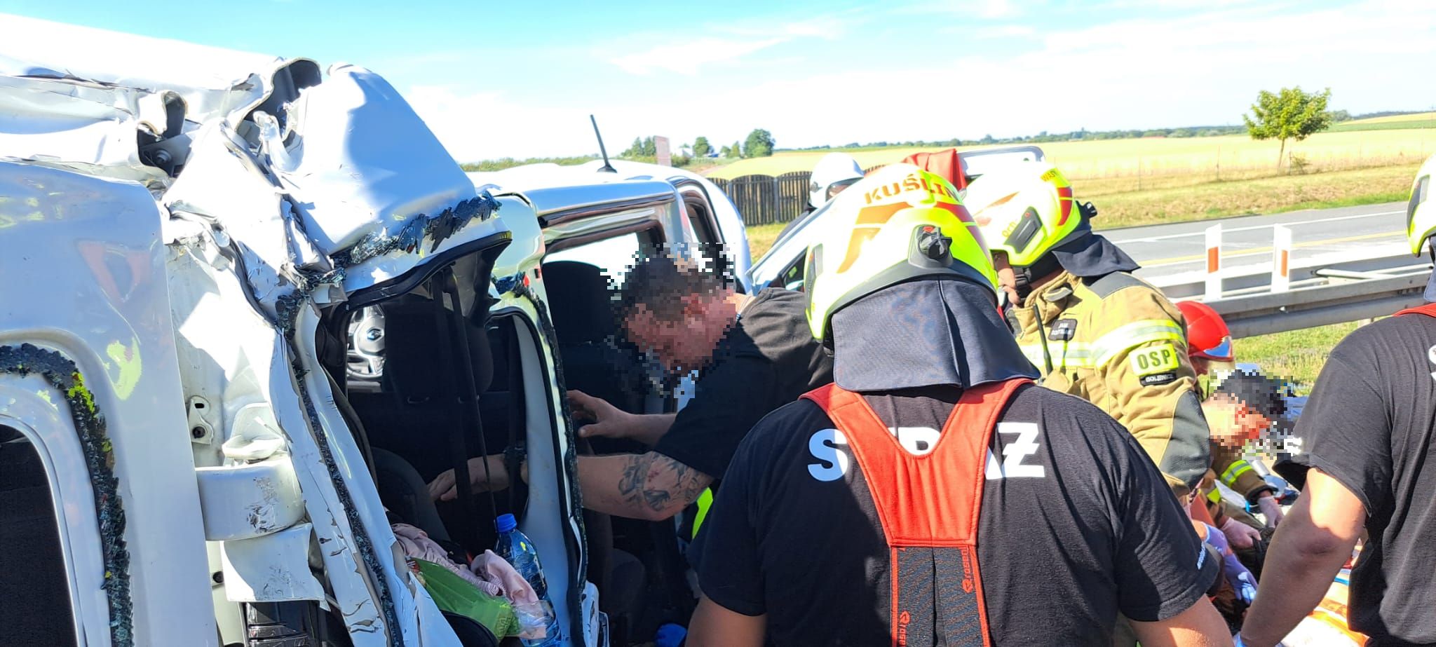 Po przybyciu pierwszych zastępów na miejsce zdarzenia zastano dwa samochody osobowe, busa oraz samochód ciężarowy z widocznymi uszkodzeniami powypadkowymi. Trzy osoby znajdowały się wewnątrz busa natomiast, osiem osób opuściło pojazdy przed przybyciem strażaków.