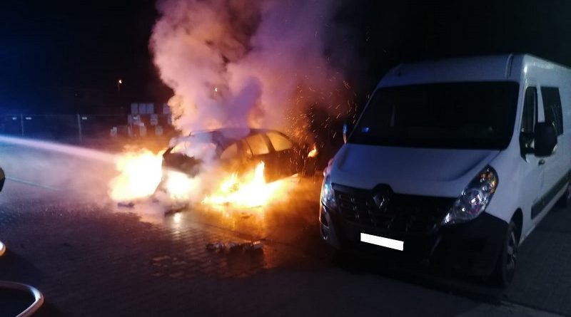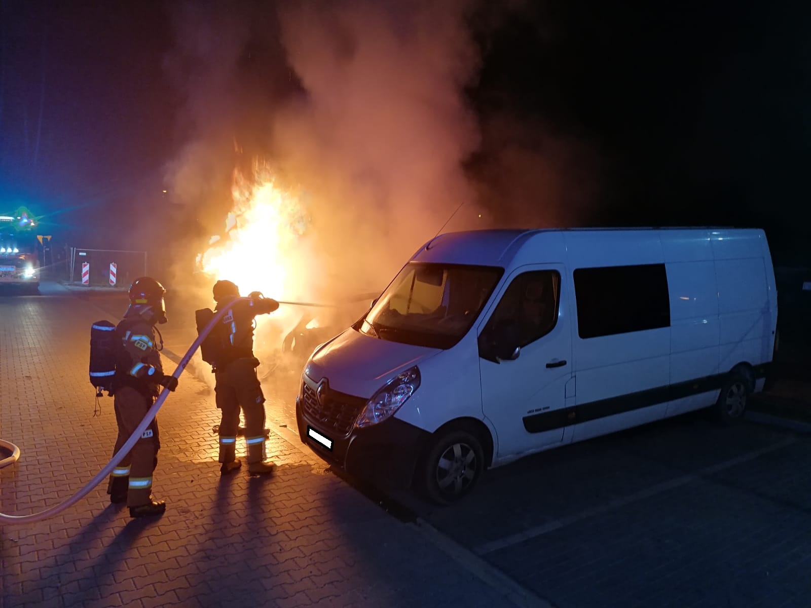 Tego samego dnia o godzinie 01:51 do Stanowiska Kierowania Komendanta Miejskiego PSP w Lesznie wpłynęło zgłoszenie o pożarze samochodu osobowe marki Renault Megane zaparkowanego przy ul. Józefa Chociszewskiego w Lesznie. Na miejsce zostały skierowane dwa zastępy z Jednostki Ratowniczo-Gaśniczej w Lesznie. Po dojeździe na miejsce zdarzenia pierwszego zastępu samochód osobowy był w całości objęty pożarem. Działania polegały na zabezpieczeniu miejsca zdarzenia, oświetleniu terenu działań i podaniu dwóch prądów piany gaśniczej na palący się samochód oraz na samochód, marki Renault Master, zaparkowany obok. W wyniku pożaru całkowitemu spaleniu uległ Renault Megane oraz uszkodzony został Renault Master. Straty oszacowano na 20 tys. zł.