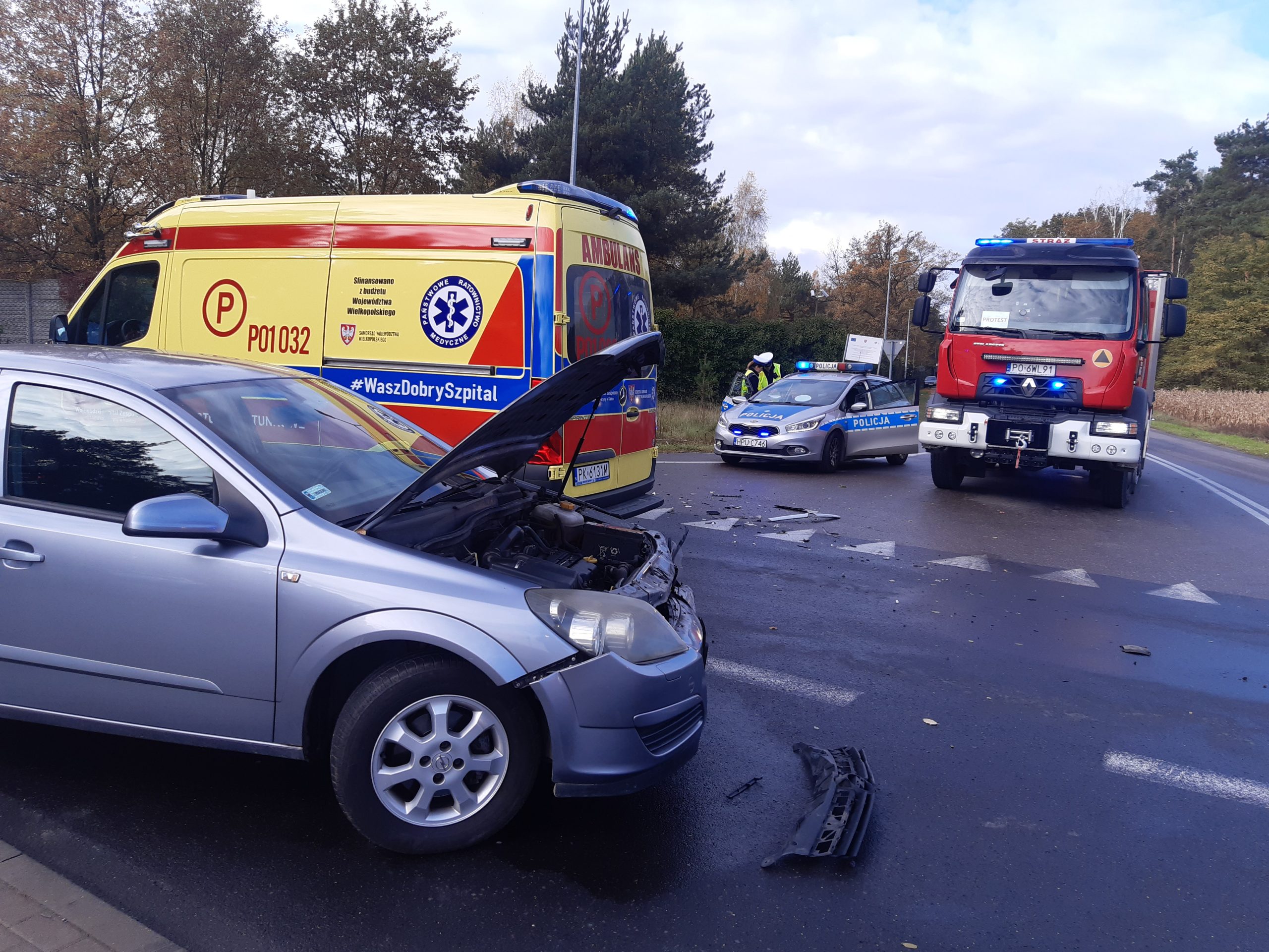 W dniu 25.10.2022r. do stanowiska kierowania Komendanta Miejskiego PSP w Kaliszu wpłynęła informacja o wypadku do którego doszło w miejscowości Szałe na skrzyżowaniu ulicy Kaliskiej i Źródlanej.