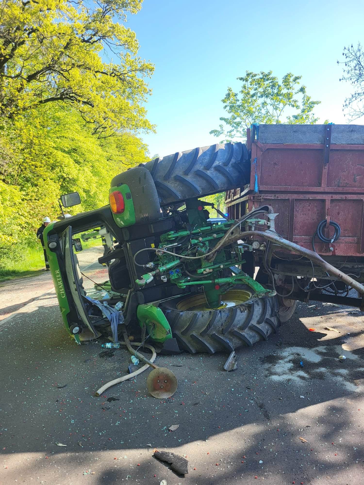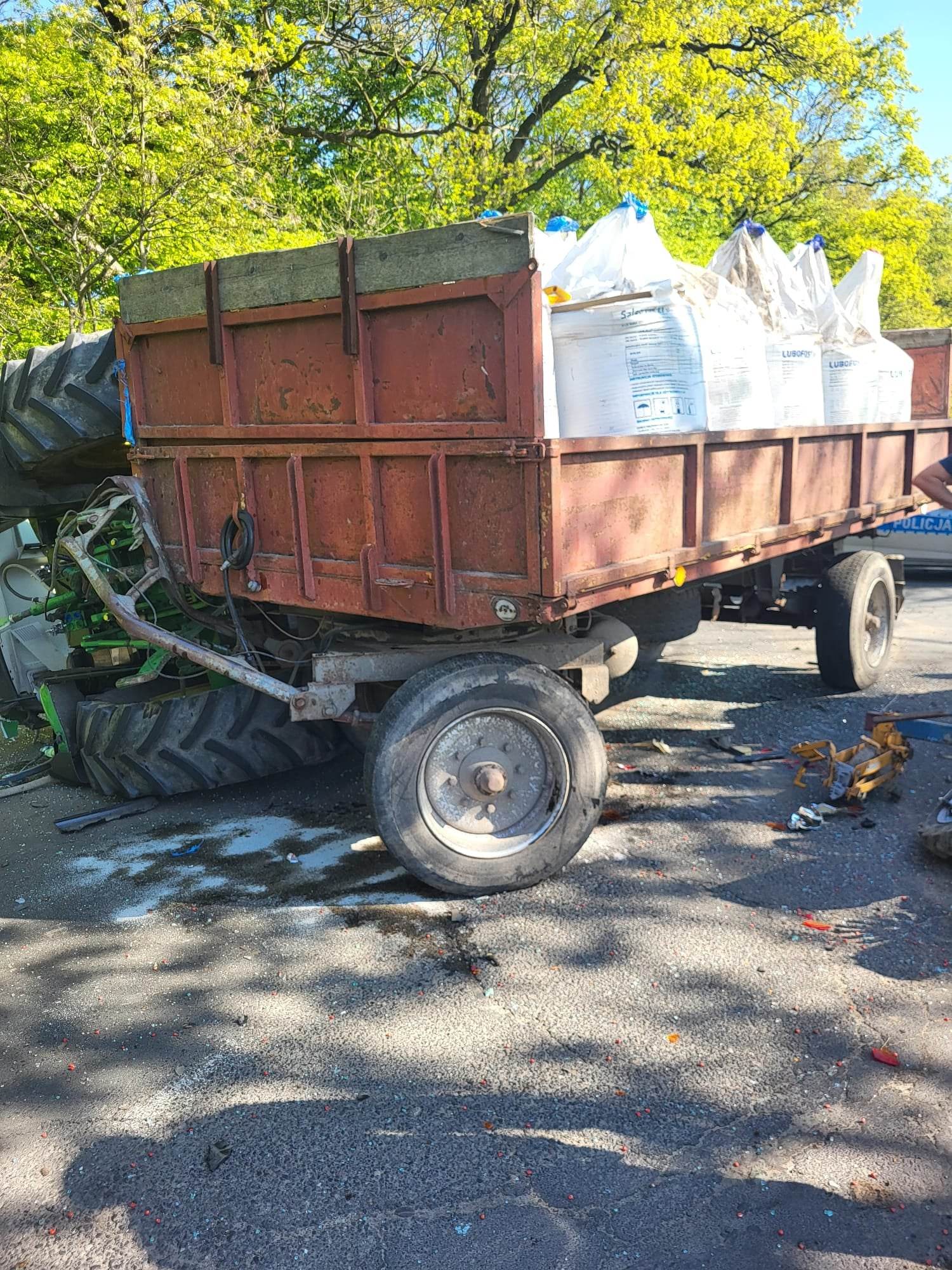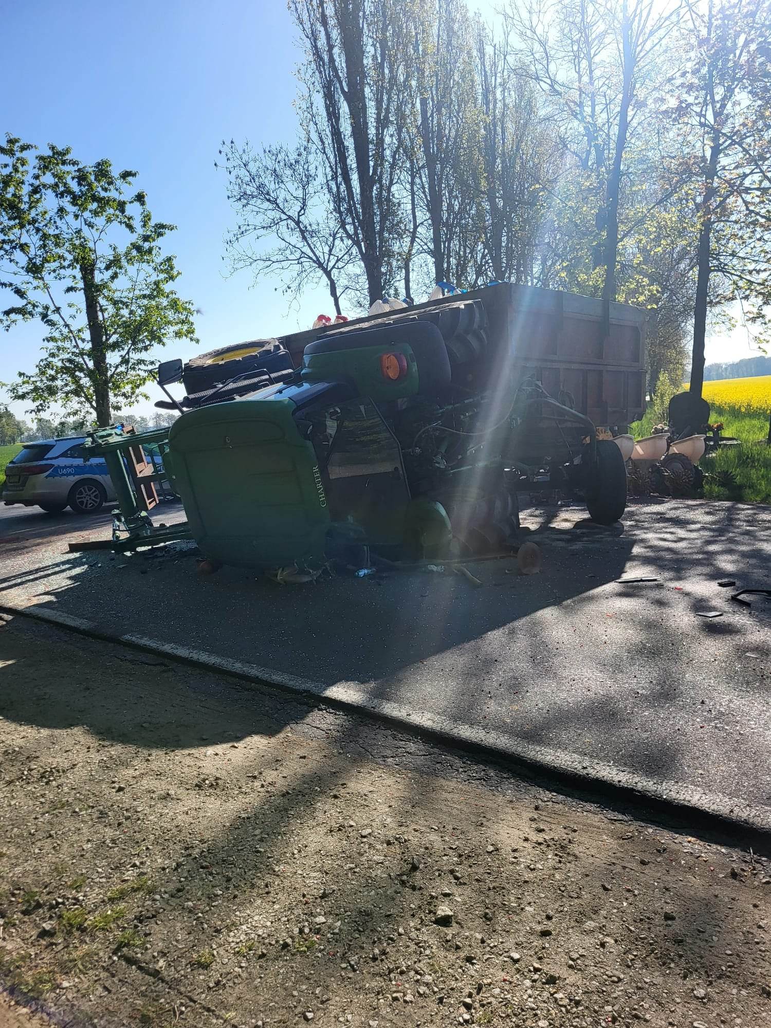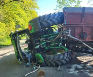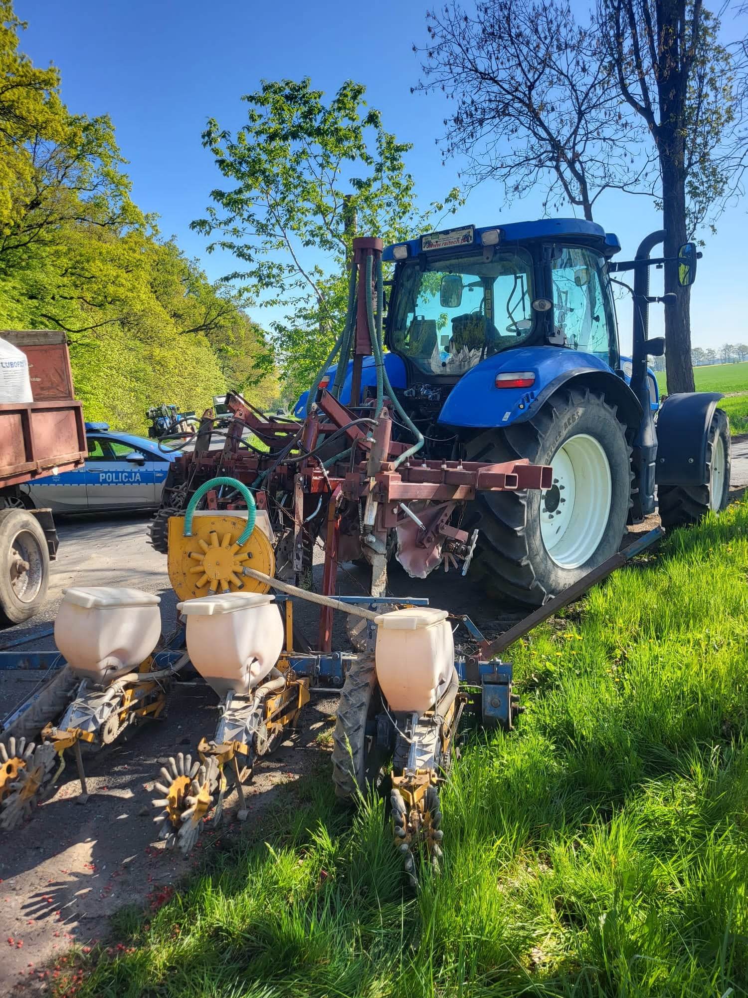 Jak ustalili policjanci, w momencie gdy New Holland na skrzyżowaniu wykonywał manewr skrętu w lewo, w podwieszony agregat uderzył John Deere ciągnący przyczepę załadowaną nawozem. Po zderzeniu ciągnik przewrócił się na lewy bok uszkadzając zaczep przyczepy.