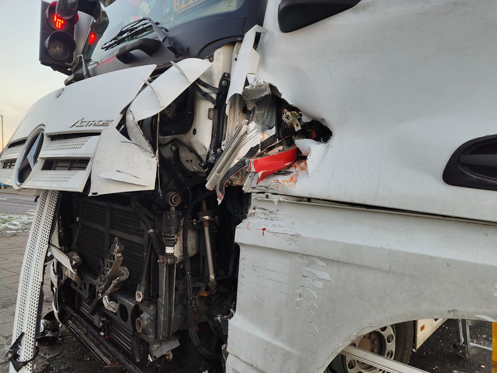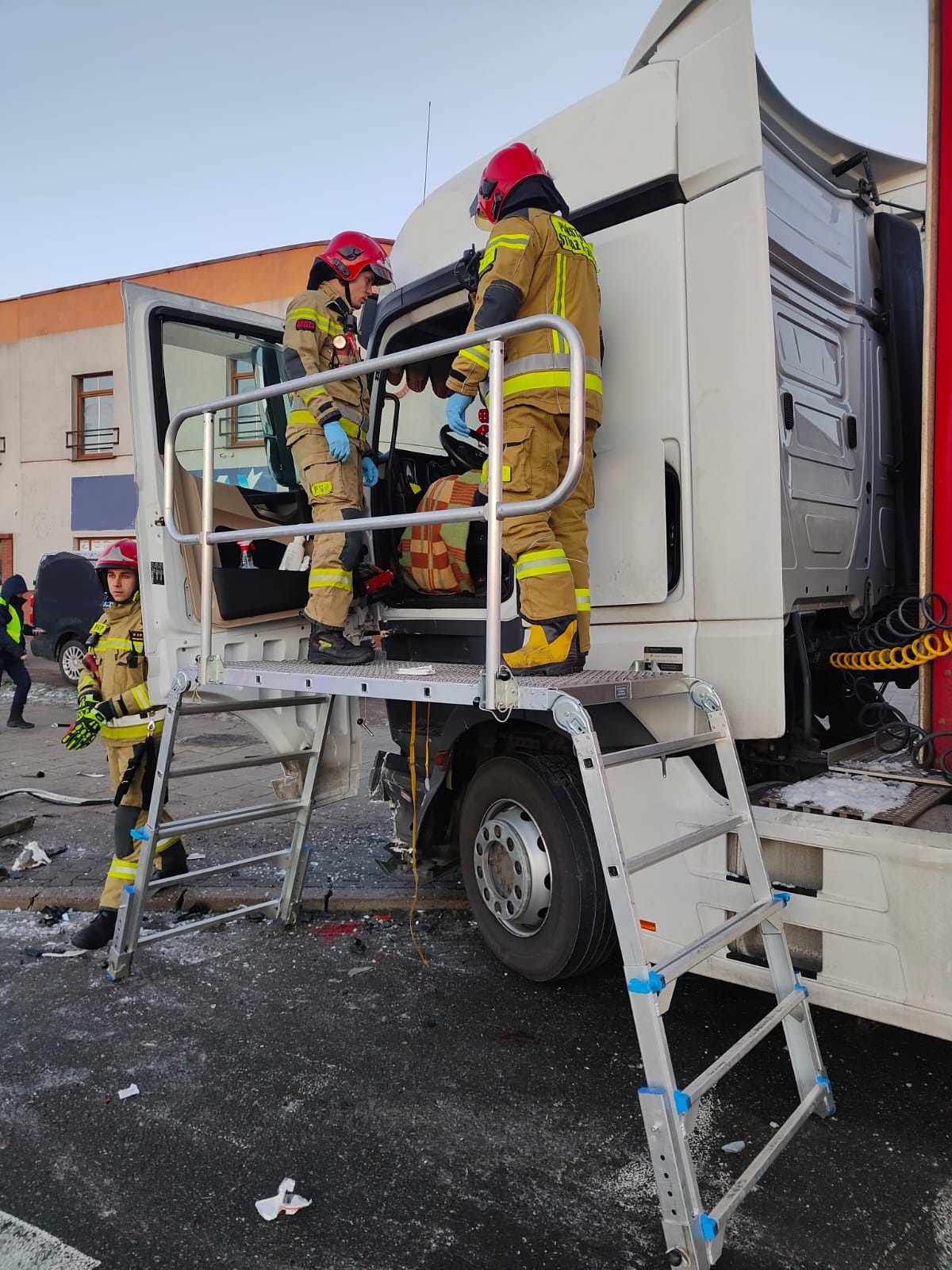 Po dojeździe na miejsce zdarzenia strażacy zastali samochód ciężarowy marki Mercedes, który na skrzyżowaniu uderzył w pojazd ciężarowy Iveco. Kierujący samochodem Mercedes był przytomny i znajdował się w pojeździe z urazem nogi, natomiast drugi kierujący opuścił pojazd przed przybyciem SP i znajdował się w pobliżu.