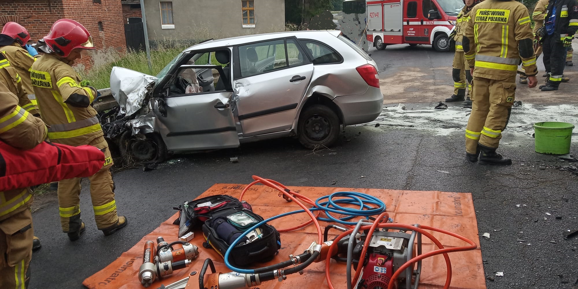 Działania Straży Pożarnej polegały na zabezpieczeniu miejsca zdarzenia oraz uwolnieniu poszkodowanego kierowcy z pojazdu przy użyciu narzędzi hydraulicznych. Następnie strażacy udzielili poszkodowanemu kwalifikowanej pierwszej pomocy a po przybyciu Zespołu Ratownictwa Medycznego został on przekazany ratownikom medycznym. Dalsze działania polegały na sorpcji rozlanych płynów eksploatacyjnych oraz usunięciu z jezdni rozbitych elementów karoserii. Na czas prowadzenia działań ruch odbywał się z utrudnieniami. Dokładne okoliczności zdarzenia ustala Policja.